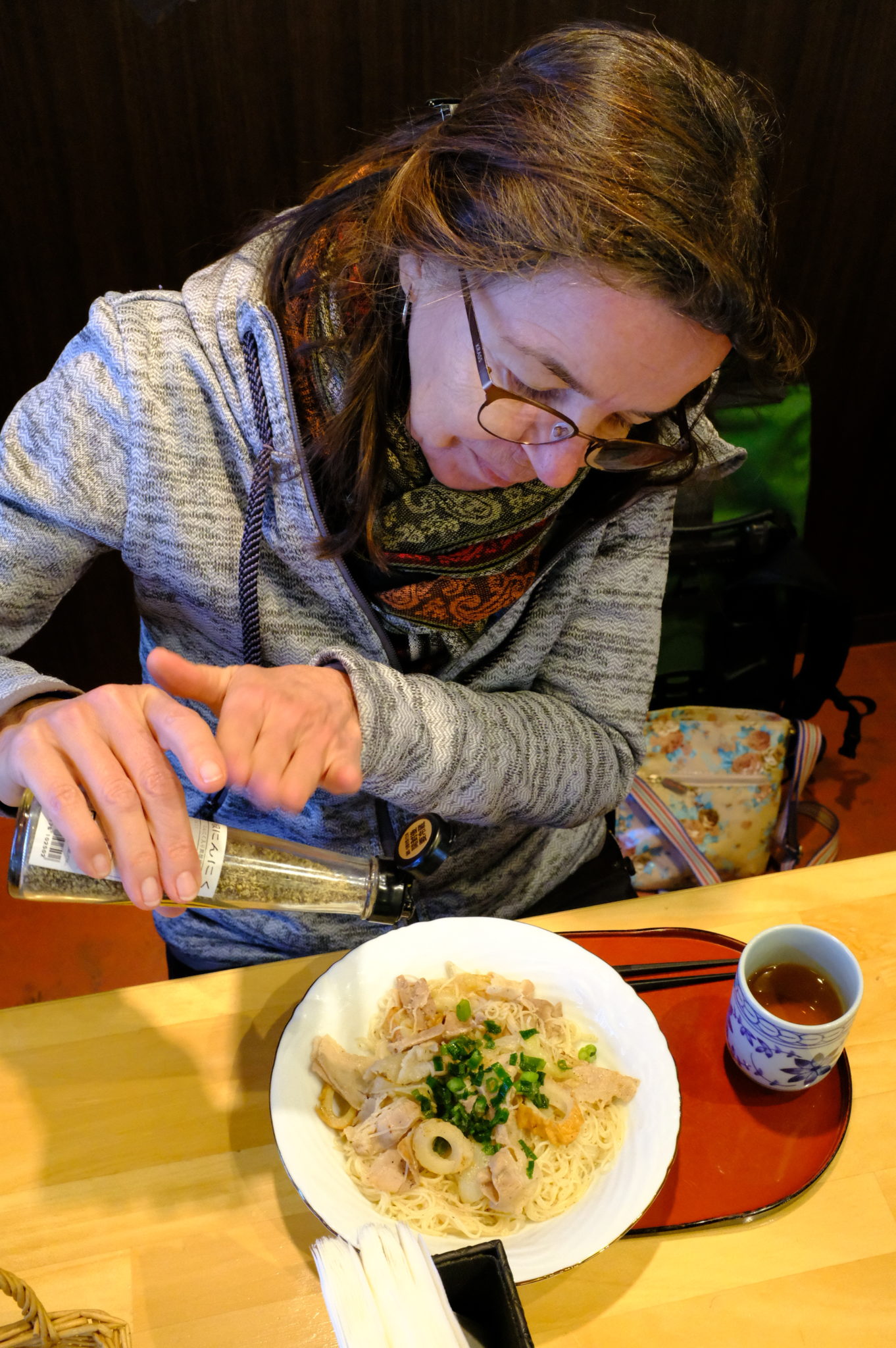 Höchster Punkt ist auf 750 Meter Höhe. Leider funktionieren unsere Motoren bei Bergetappen immer noch nicht. Hier in Unzen haben wir eine einfache Ryokan. Zum Baden gehen wir 3 Minuten in ein Onsen.