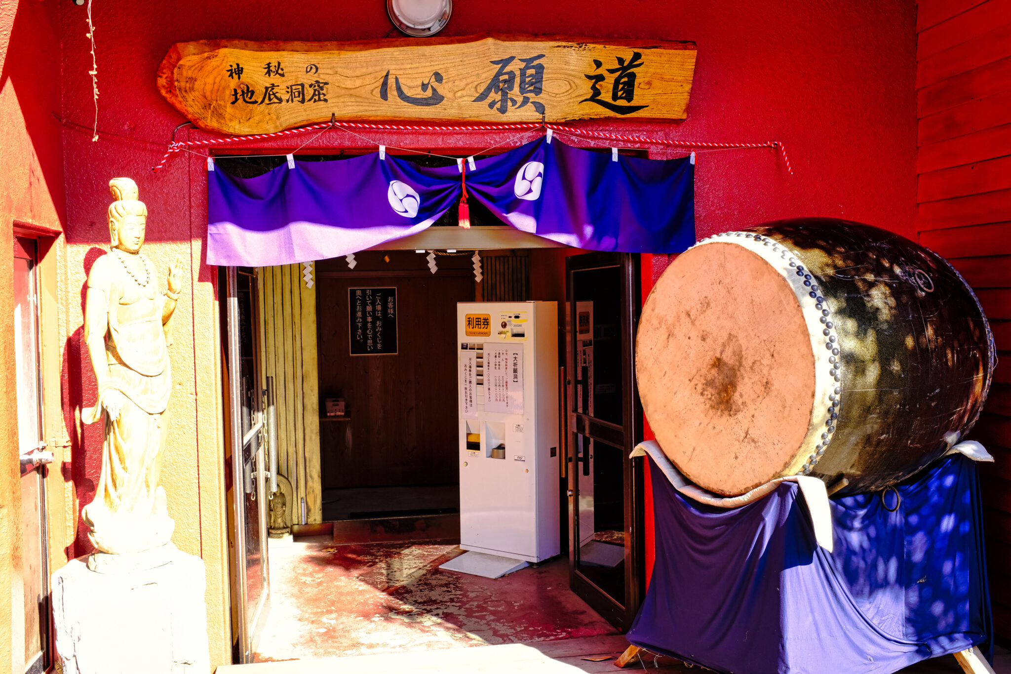 Vor dem Höhleneingang gibt es einige shops und Schreine, mit riesigen Plastikbuddas.