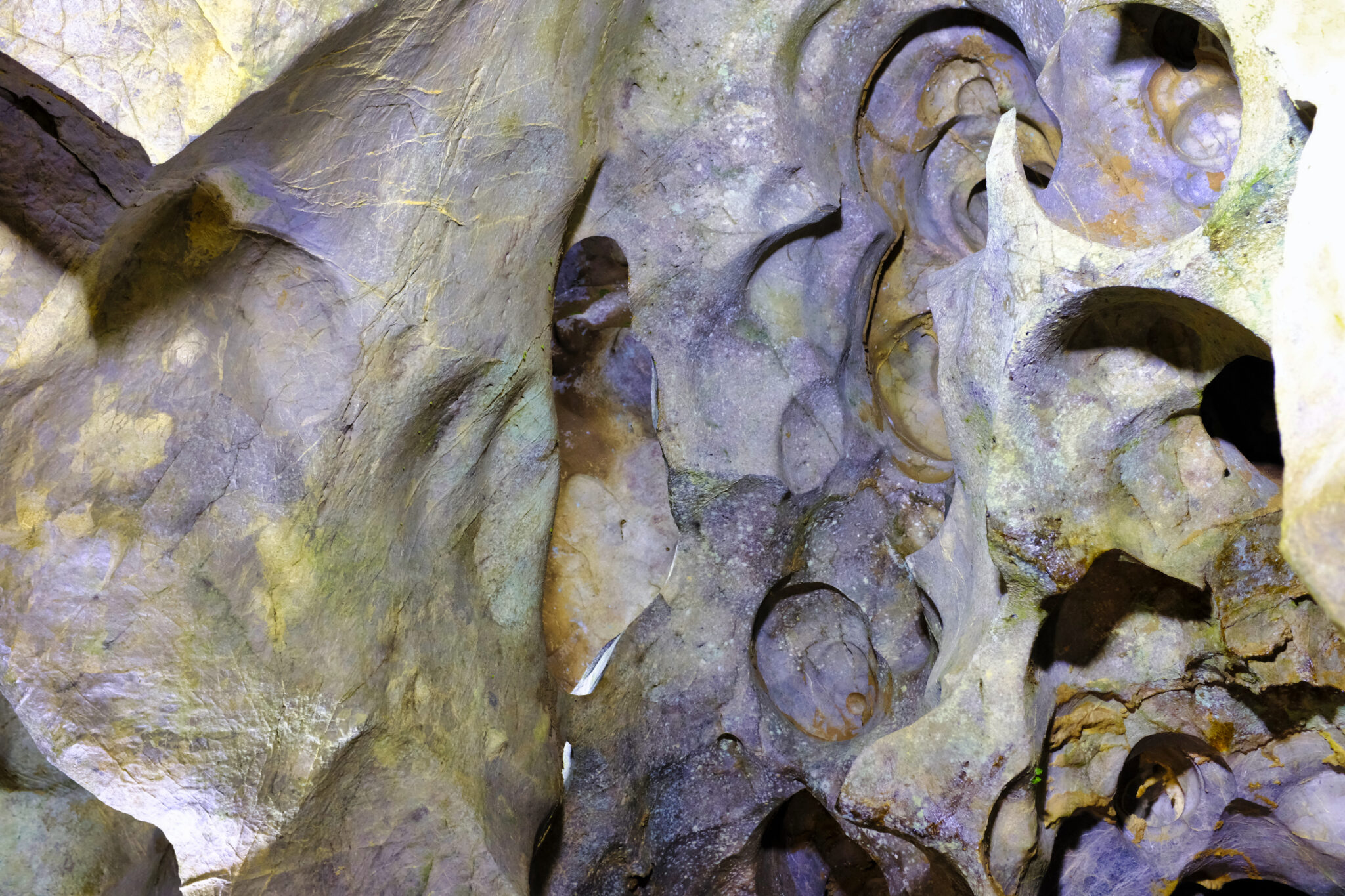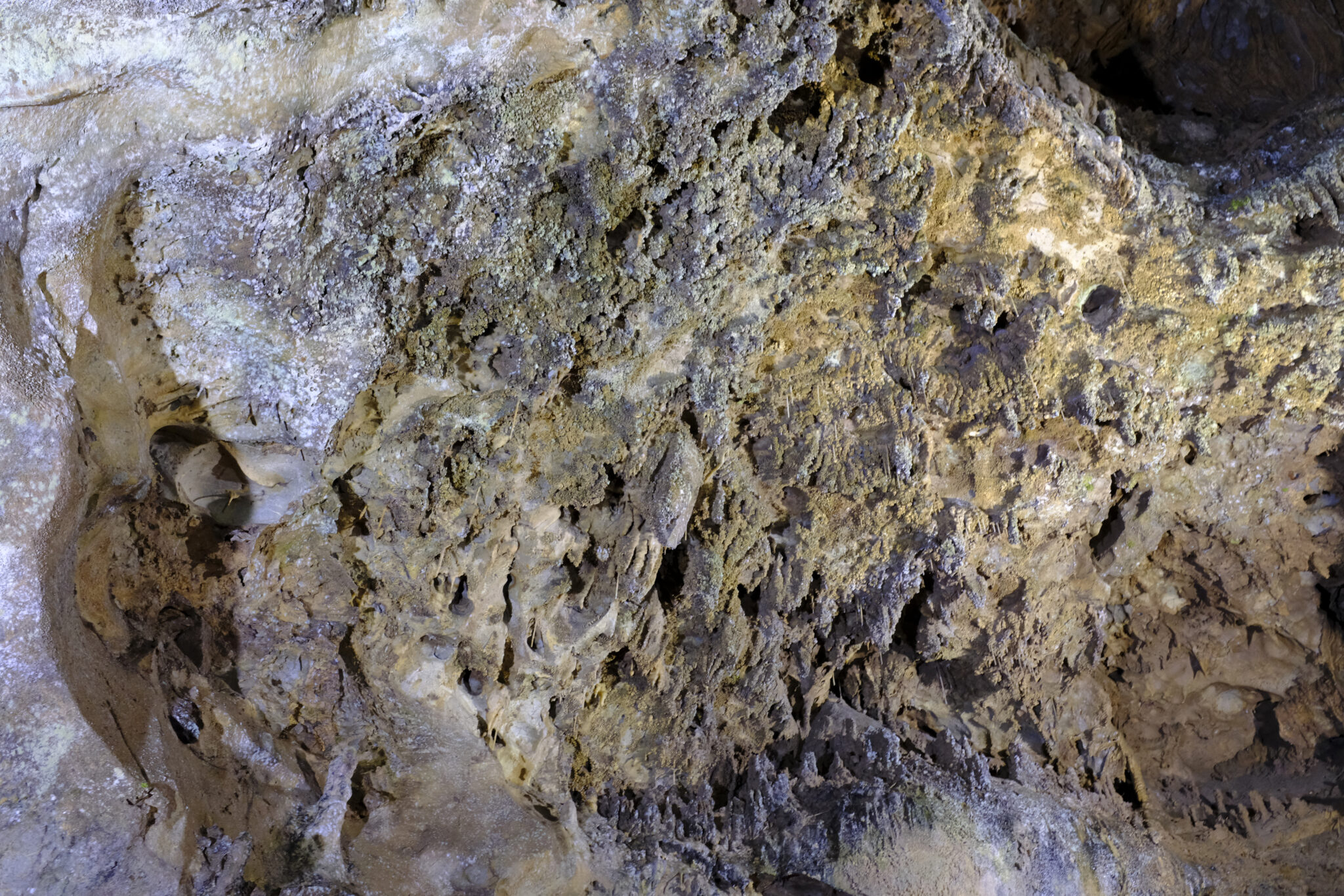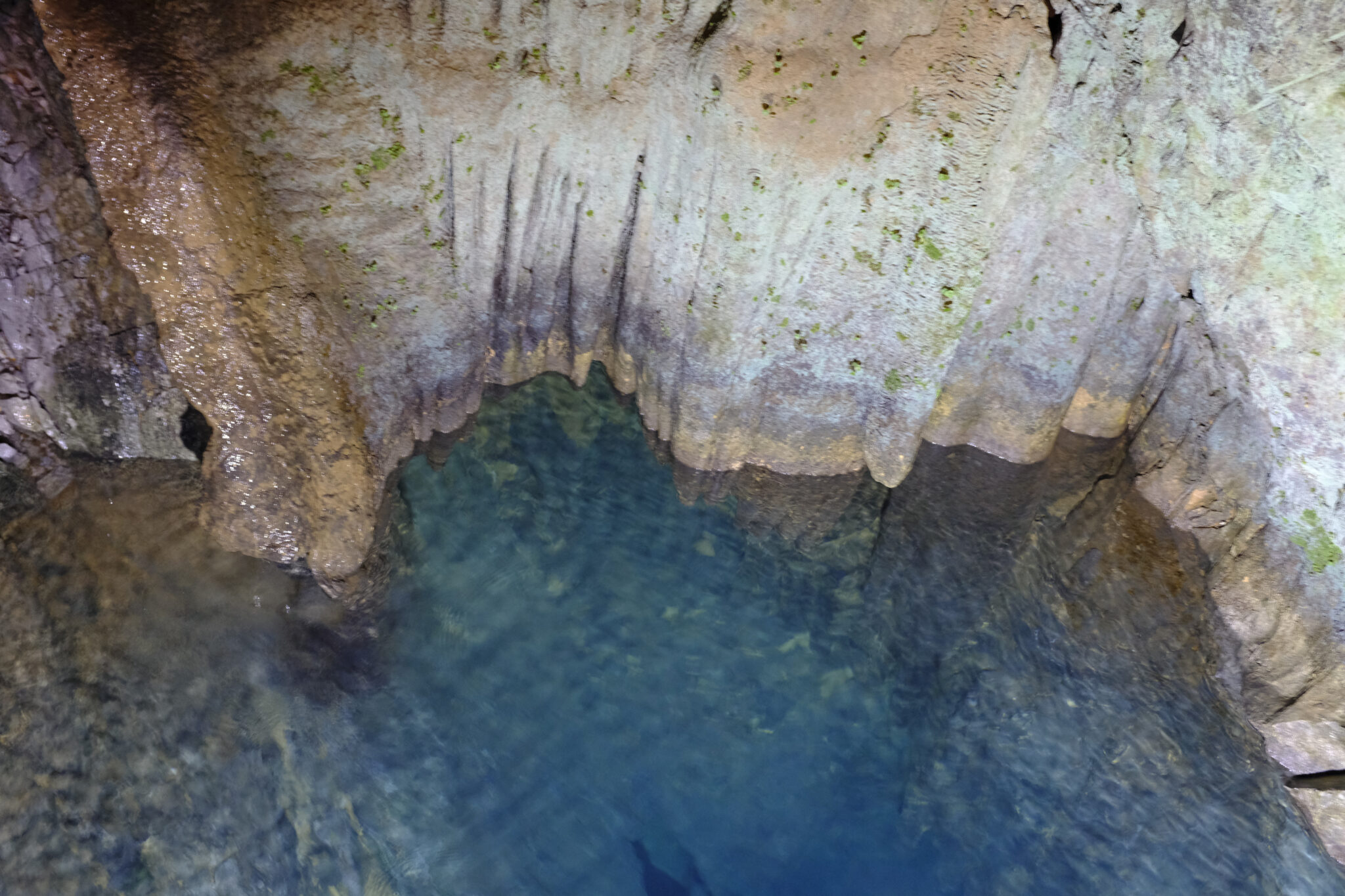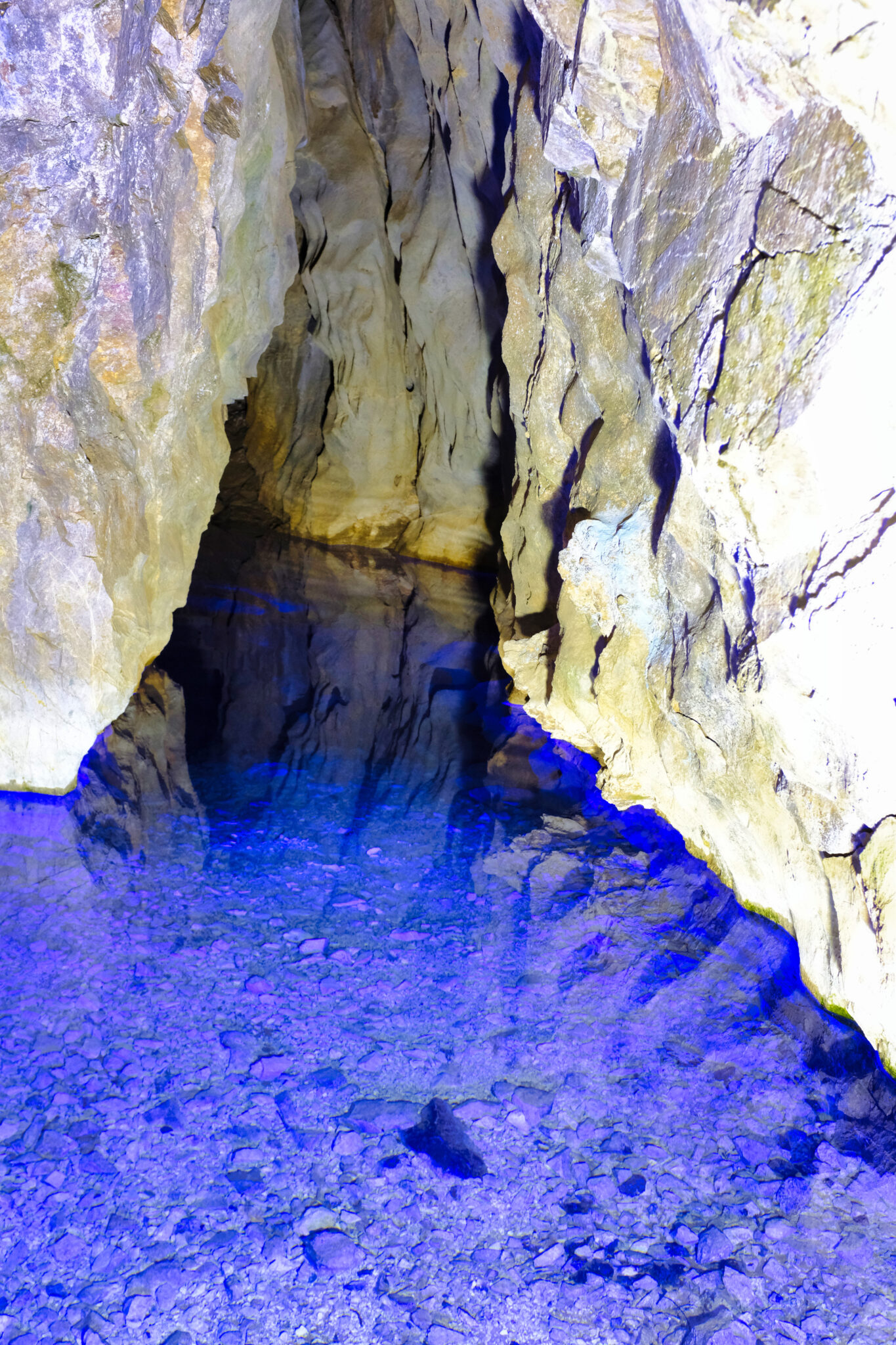 - Blau beleuchtet. Der Eingang zur Höhle, Hier ist auch der Tauchereinstieg.