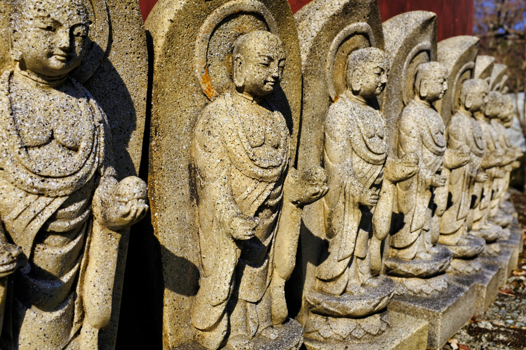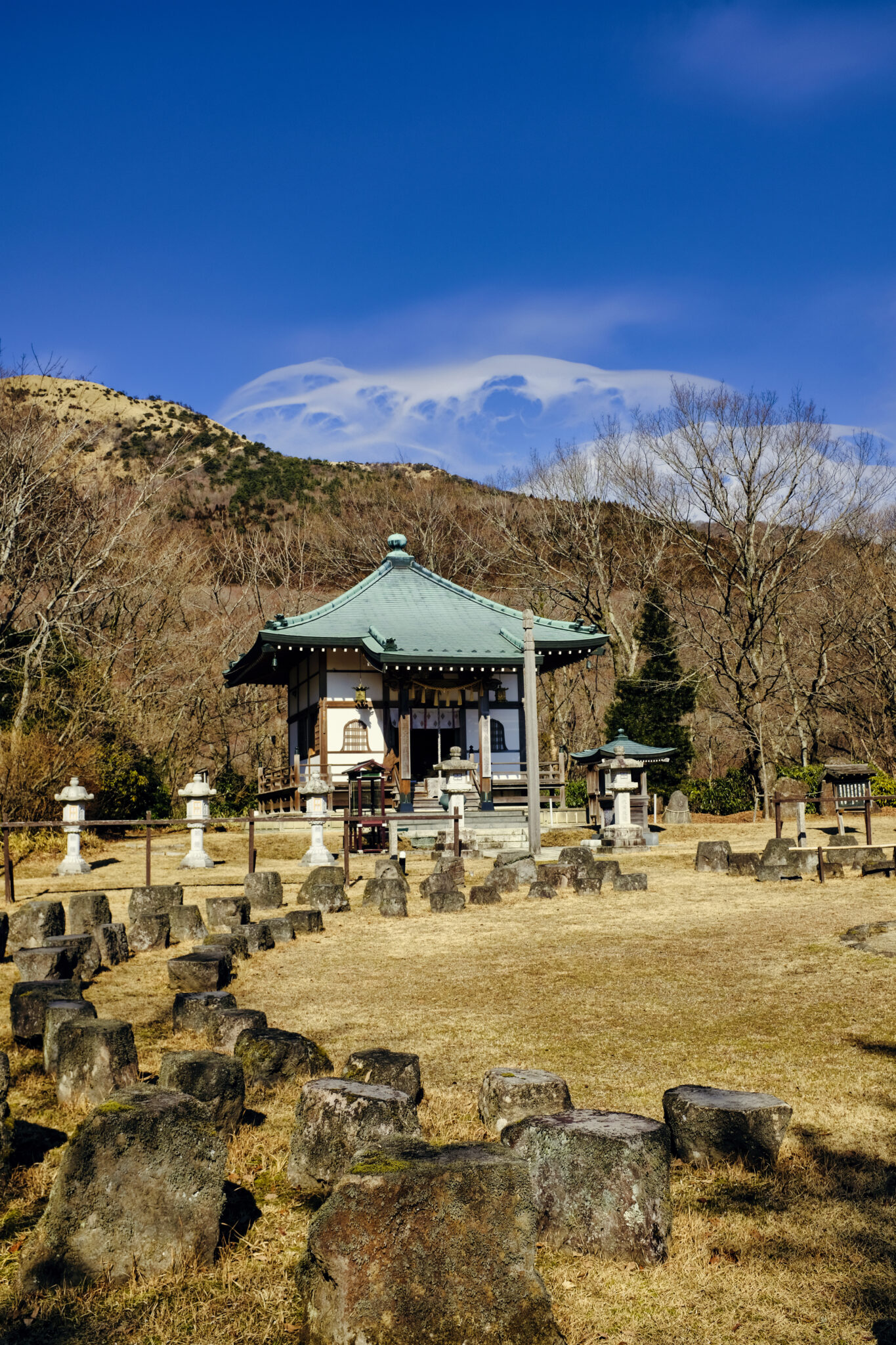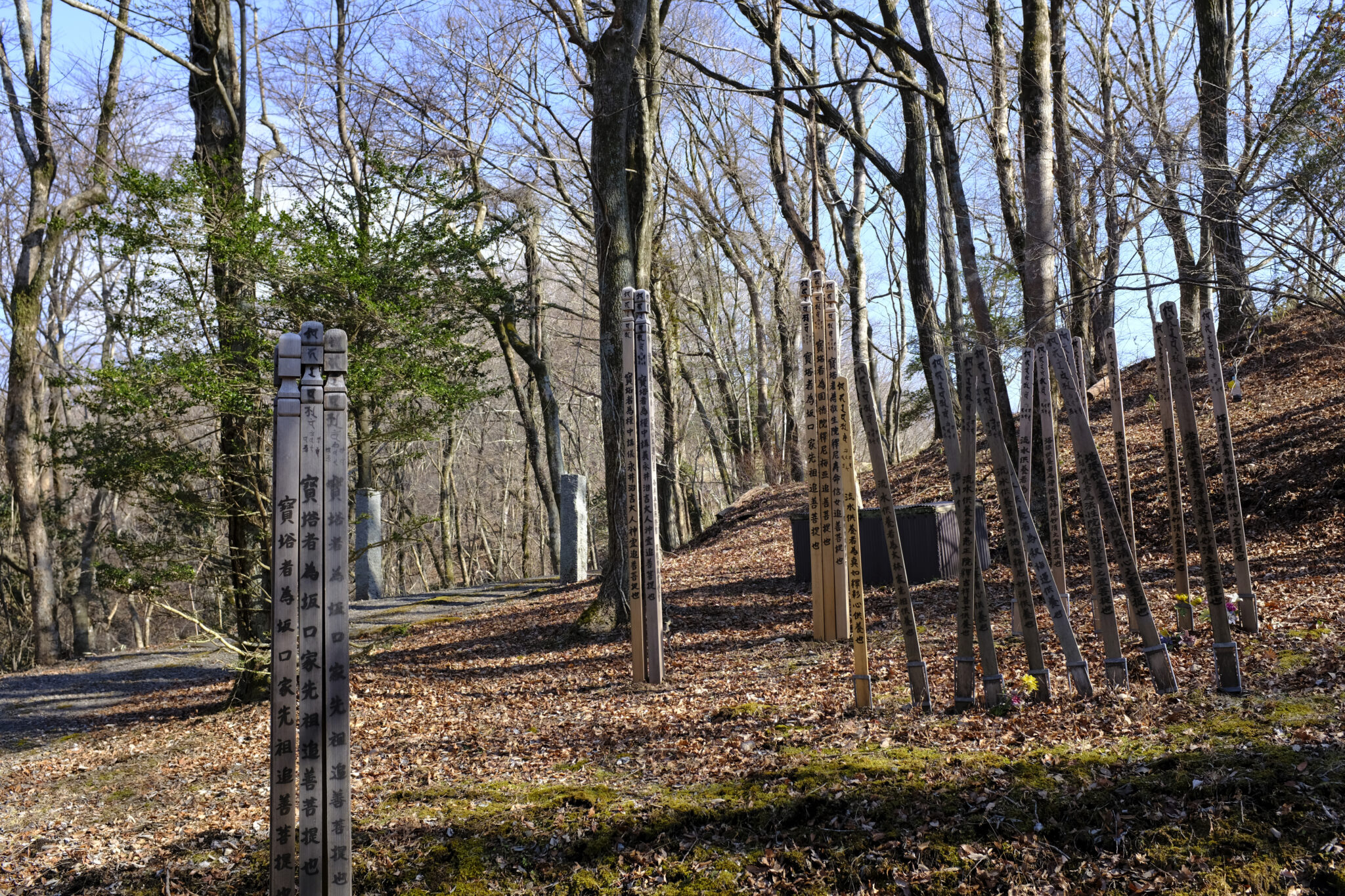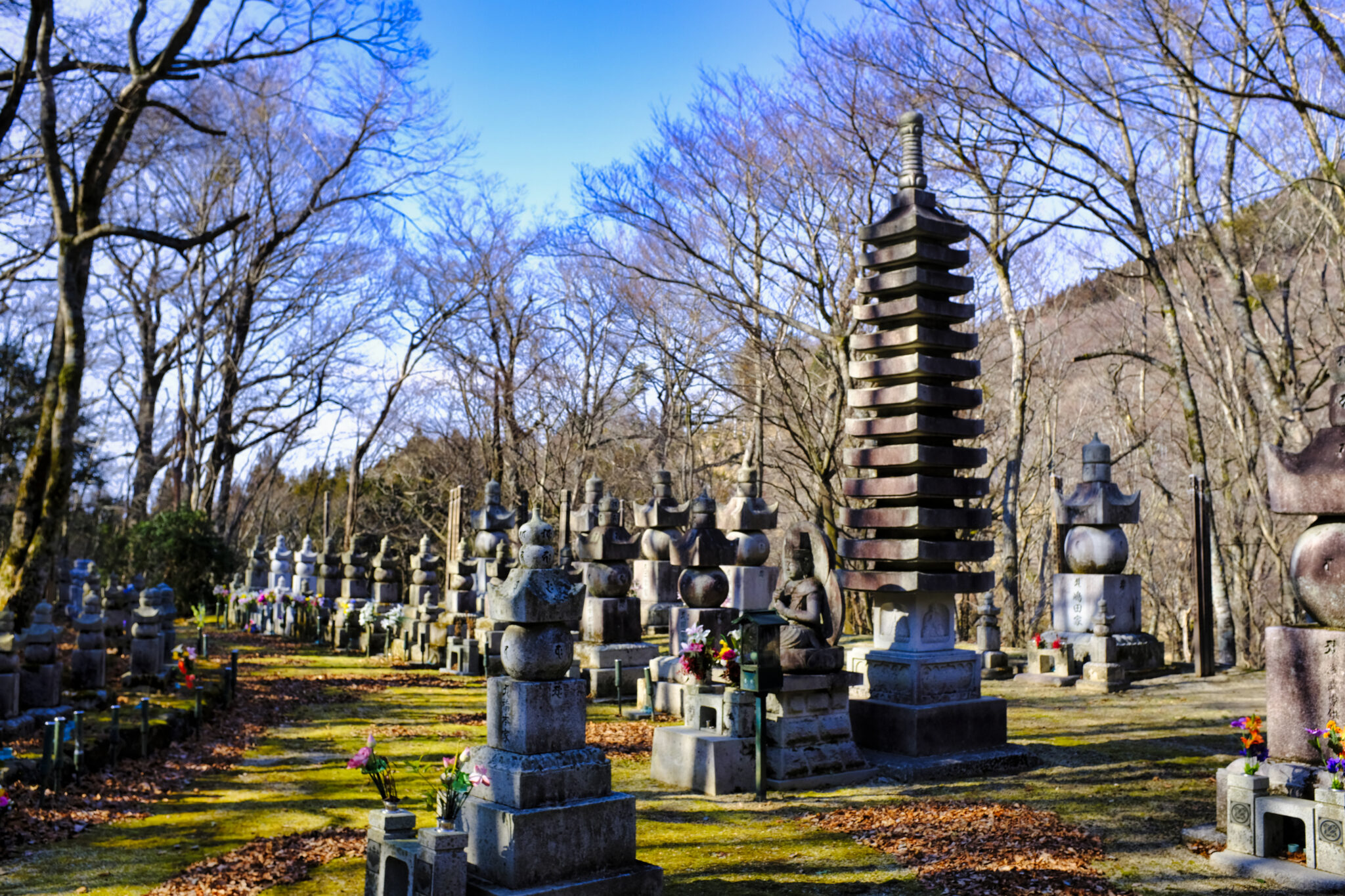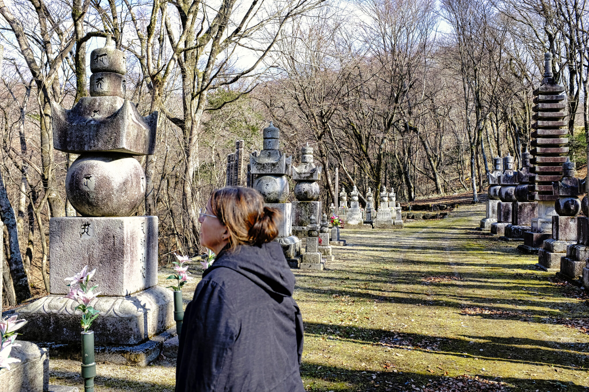 - Wir starten direkt von Kurokawa. Es geht ein kleiner ungepflegter Weg mitten durch den Wald hoch nach Senomoto. Nach 5 Kilometer erreichen wir den Friedhof der den Tempel umgibt.