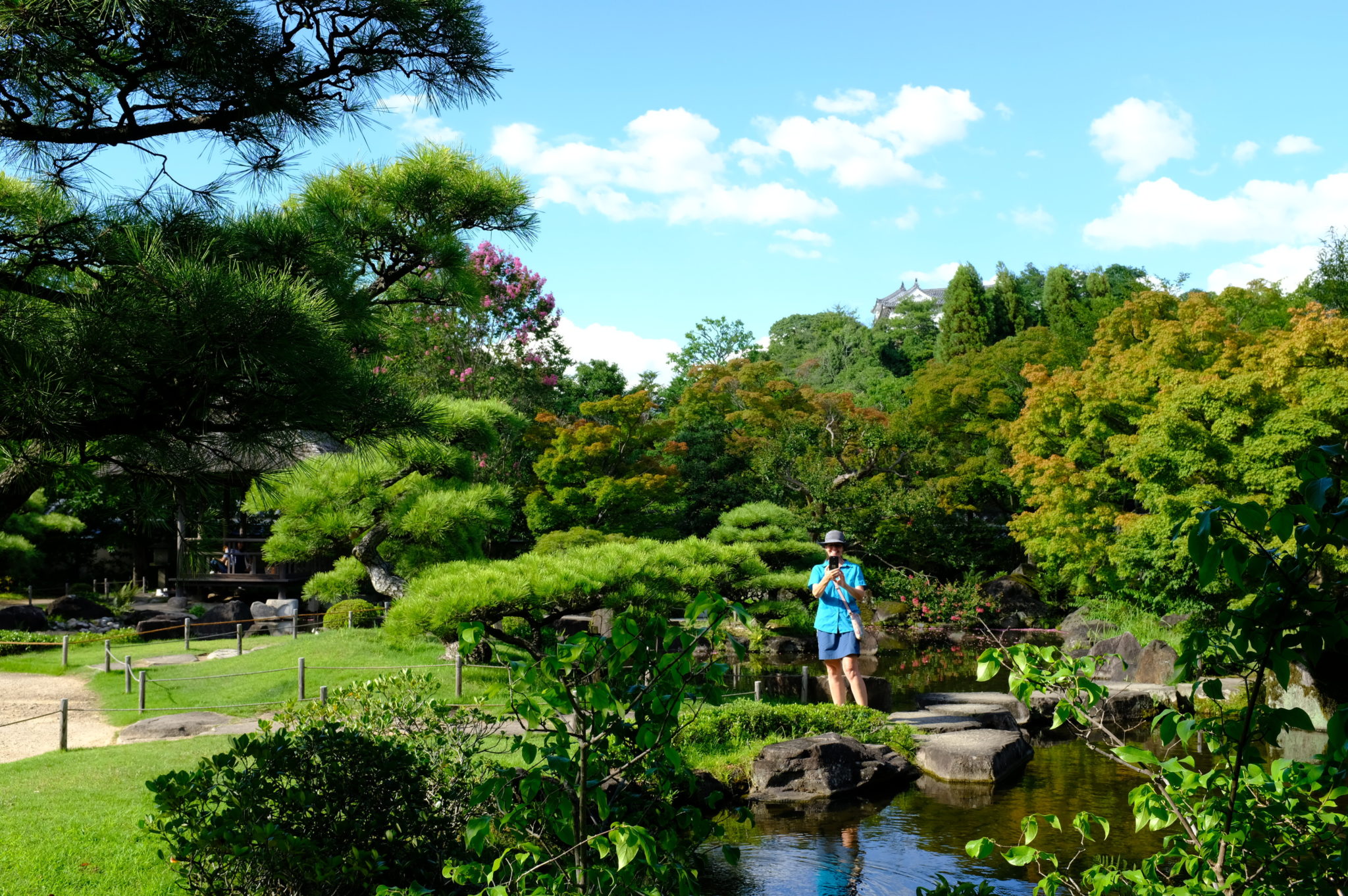 Montag 5. August, heiße  Autofahrt durch Osaka nach Himeji. Dort Besuch der weißen Burg und des Koko- en Gartens.