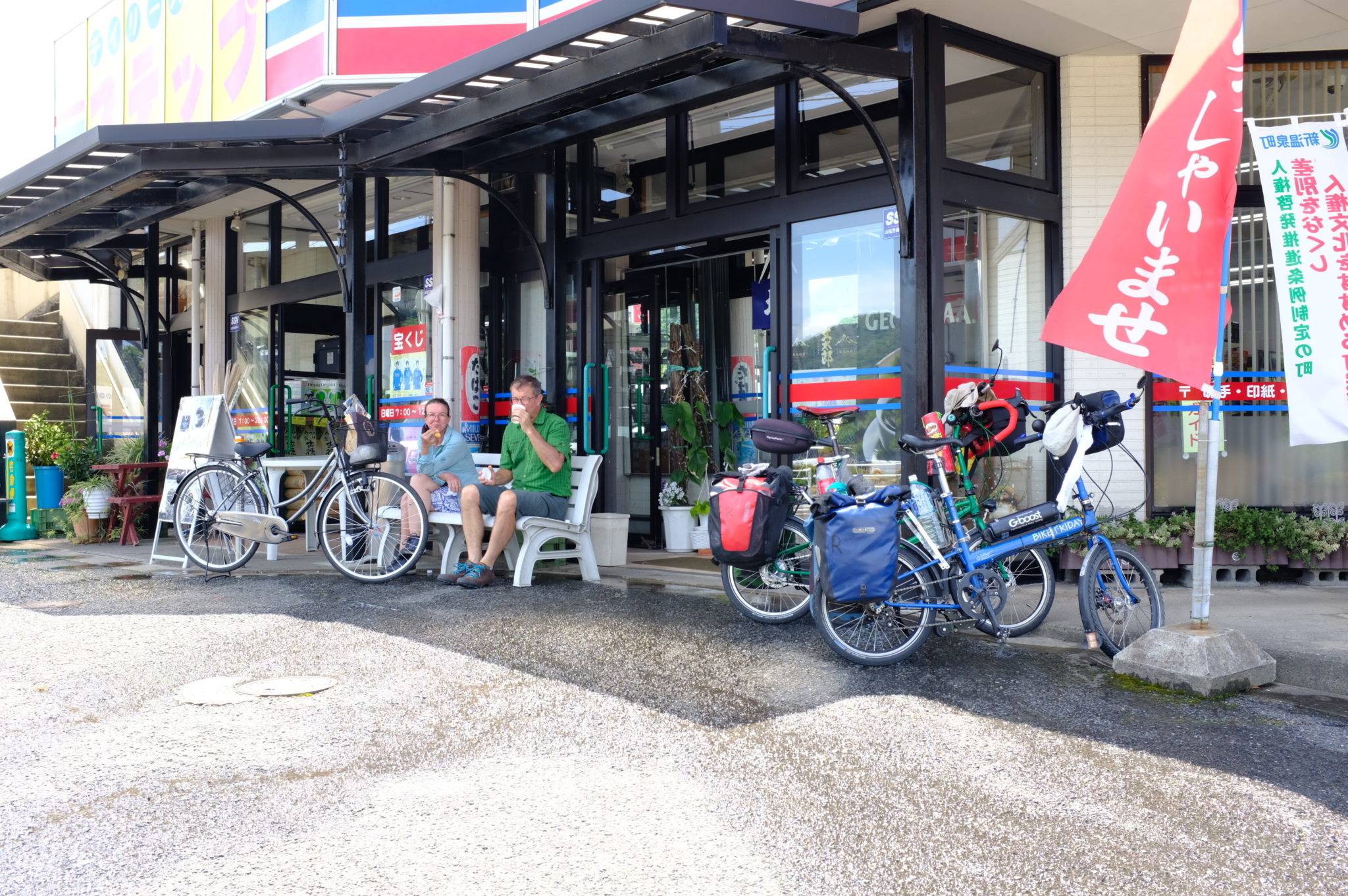 Da wir die Räder mitsamt Motor und Akkus schon im Vorfeld nach Japan geschickt hatten, kommen wir mit leichtem Gepäck gegen 10 Uhr morgens am Flughafen Osaka Kansai an. Fast 100% Luftfeuchtigkeit und 38 Grad warm. Sehr angenehm nach dem tiefgekühlten Eisbombenflieger.
