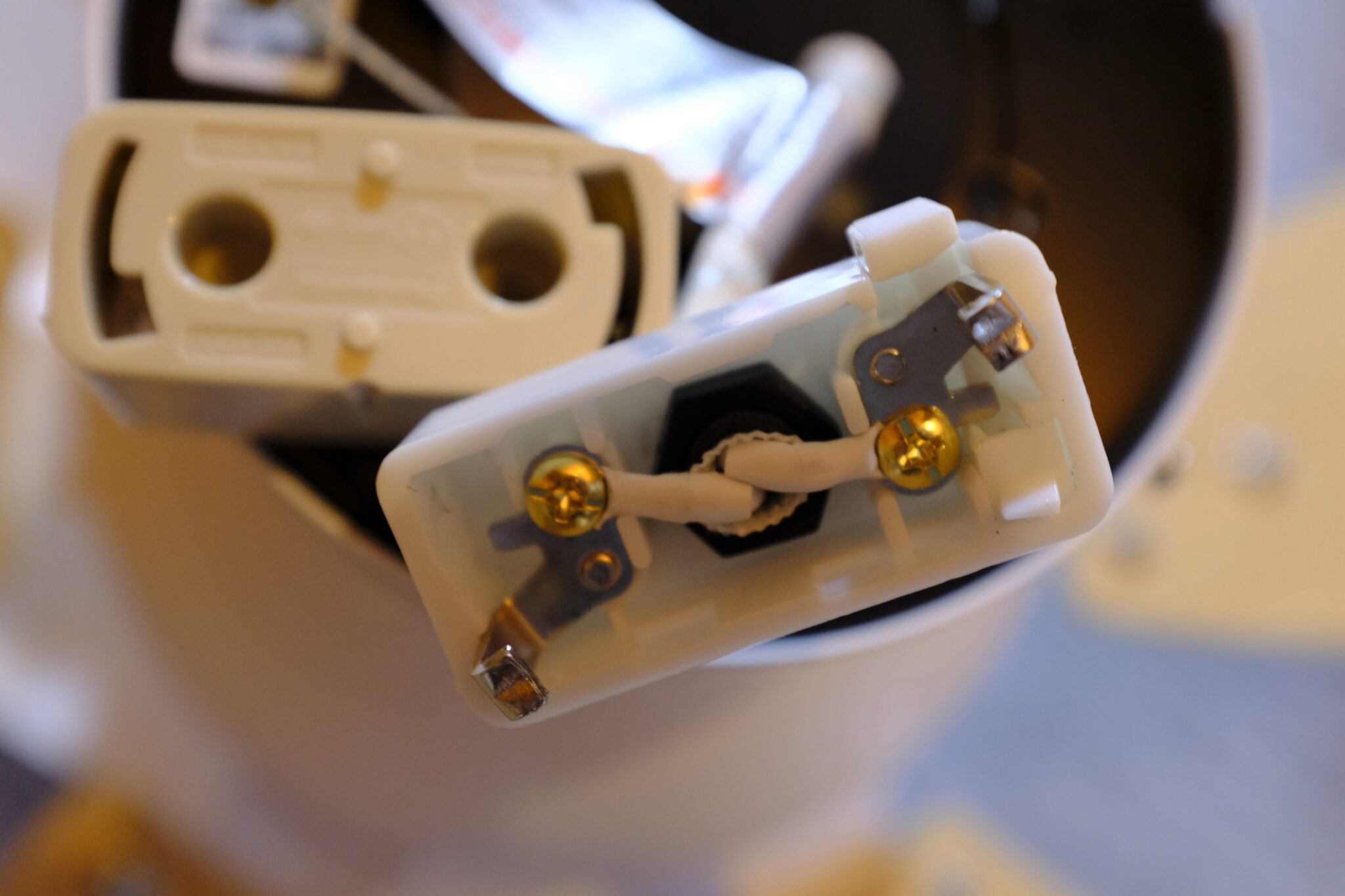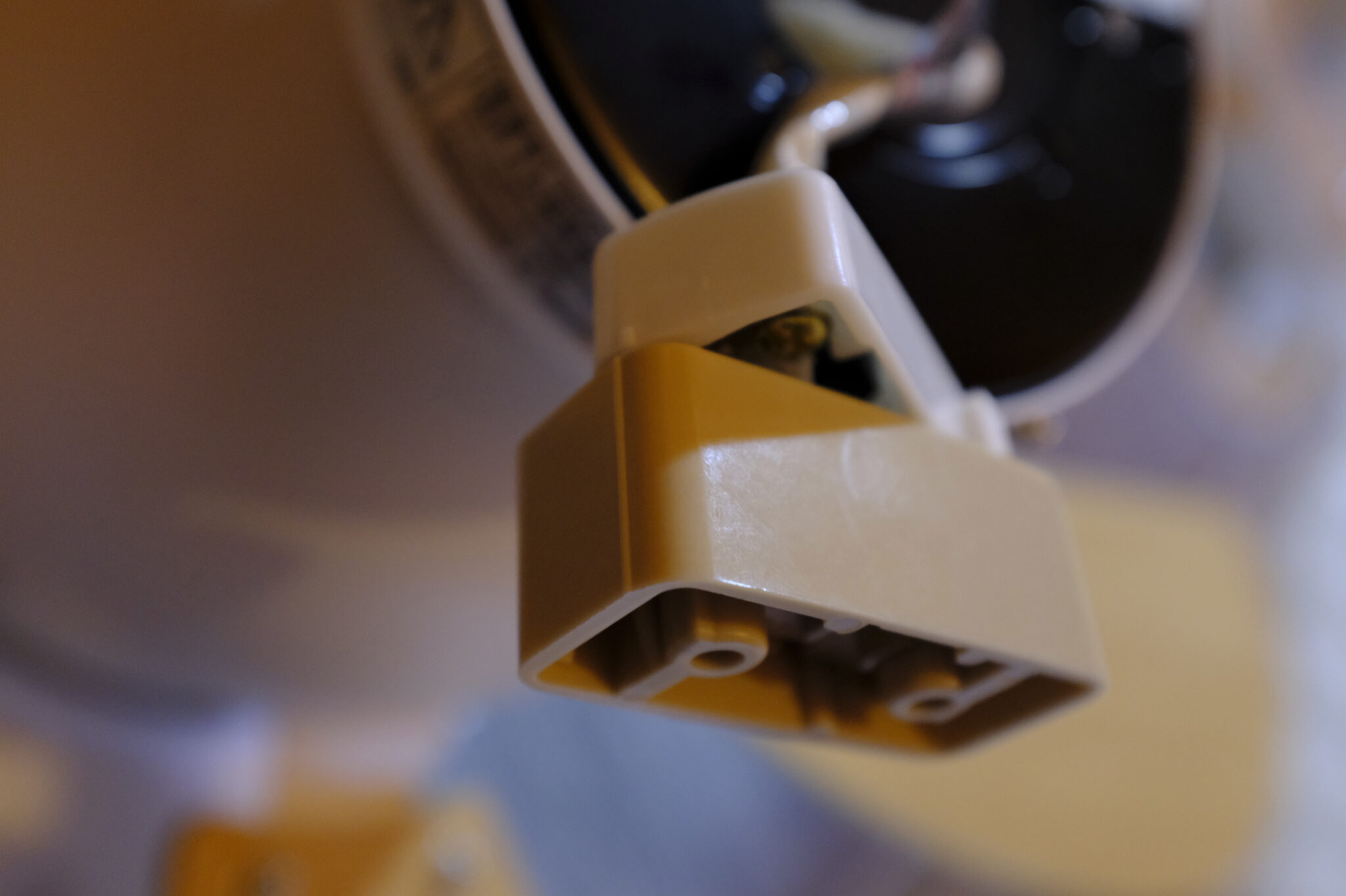 - Weißes Teil ist an der Lampe angebracht. Braunes Teil ist an der Decke befestigt und mit dem Stromnetz verbunden.