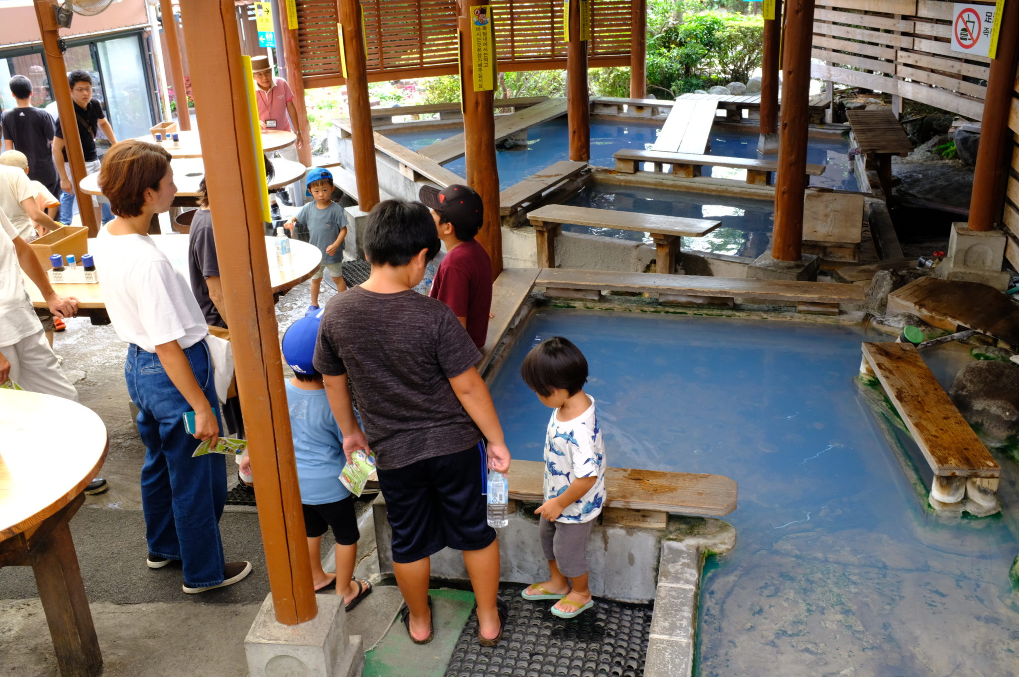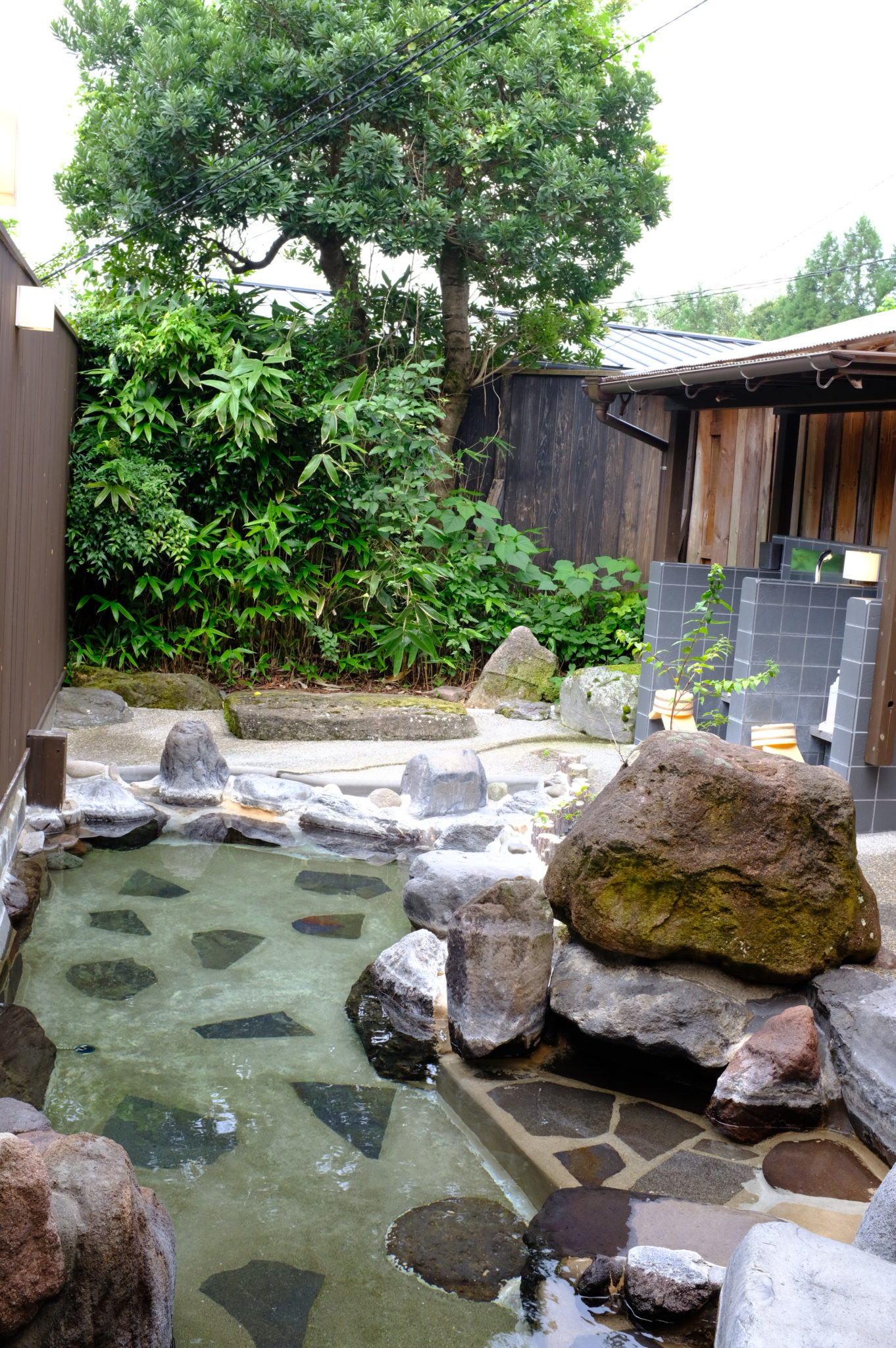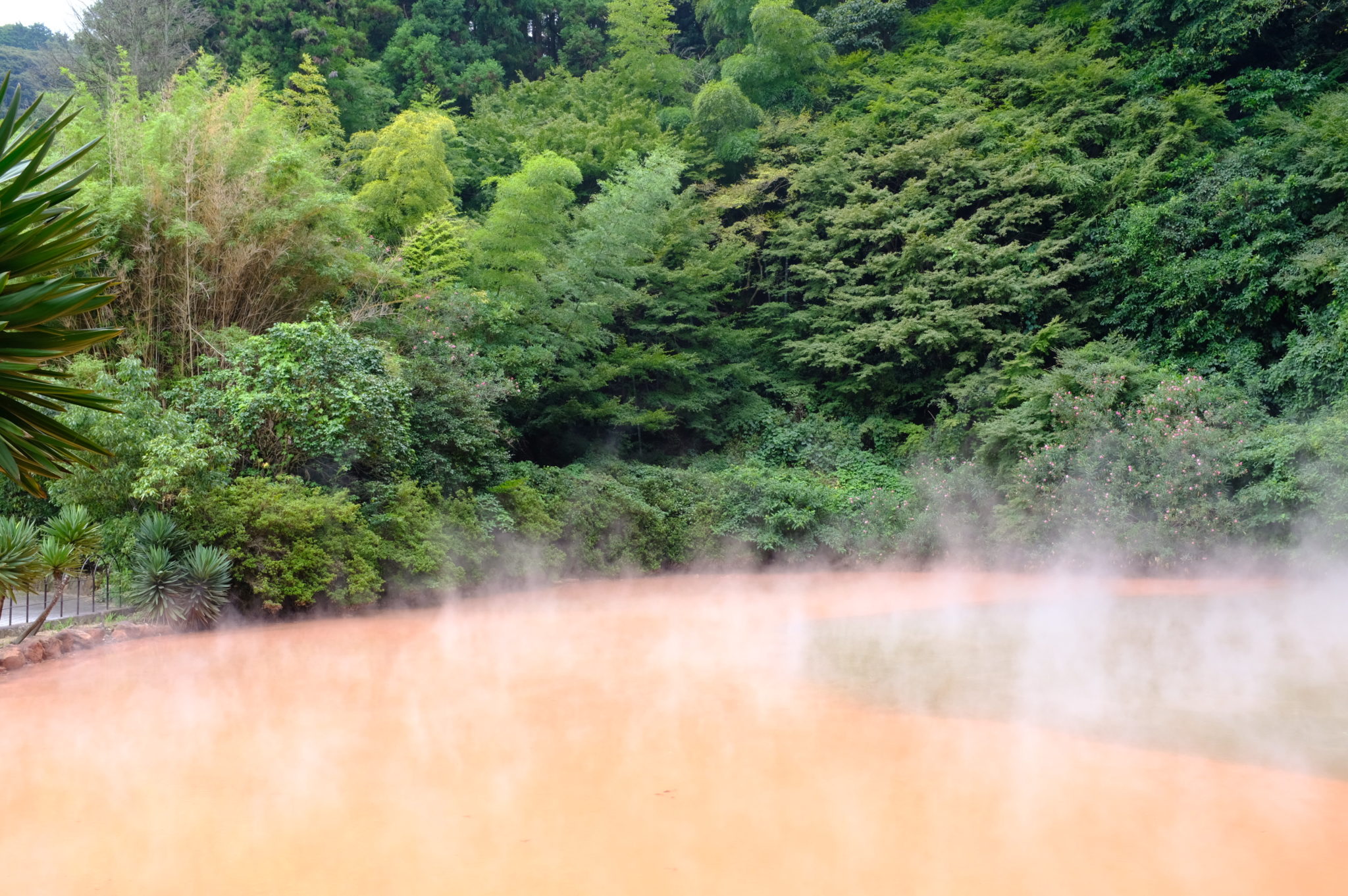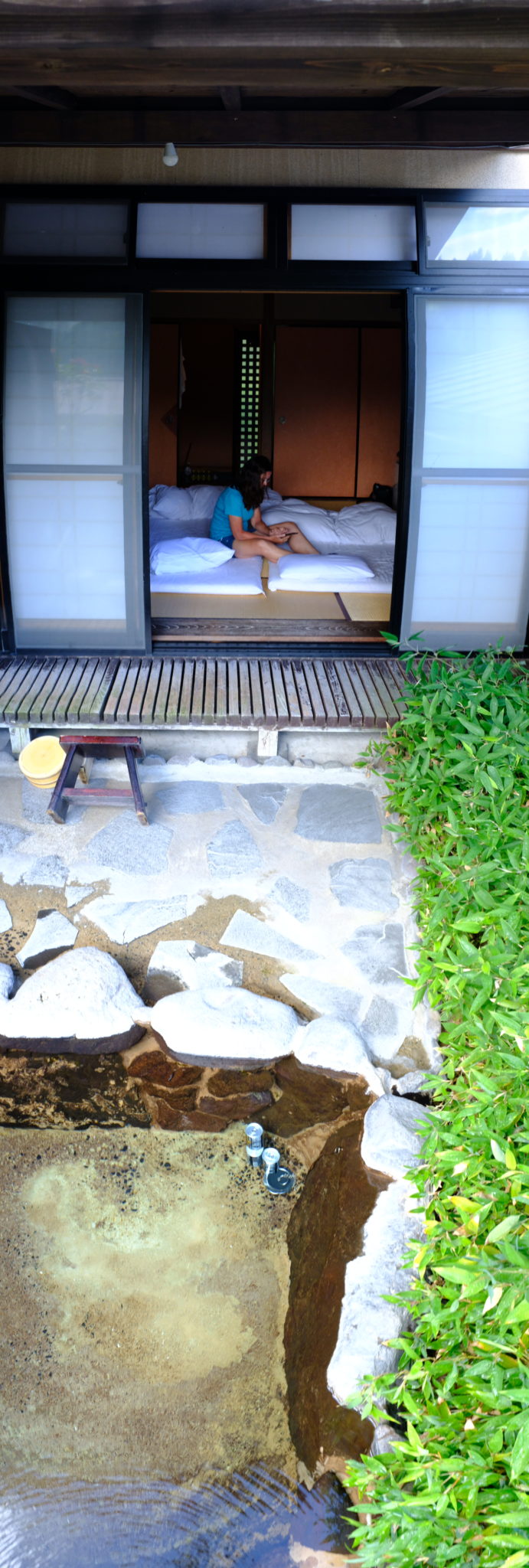Am Nachmittag kommen wir in Beppu an. Wieder mal zu früh. Entspannt sitzen wir vor der Unterkunft und hängen unsere Füße ins Thermalwasser. Beppu ist die wohl berühmteste Onsen Stadt Japans.