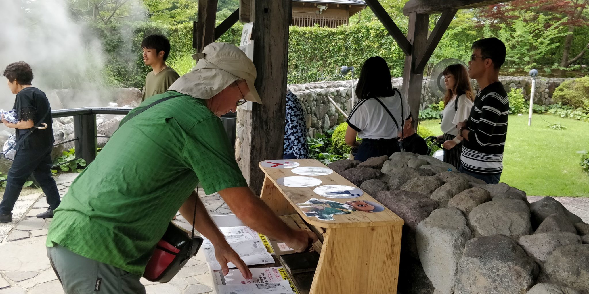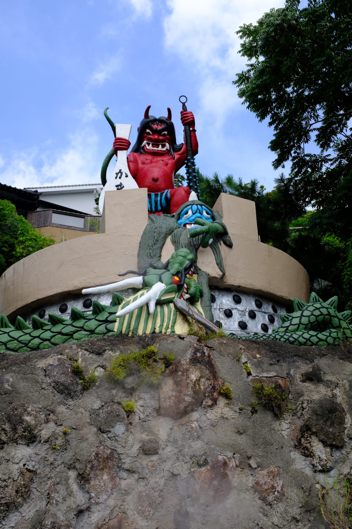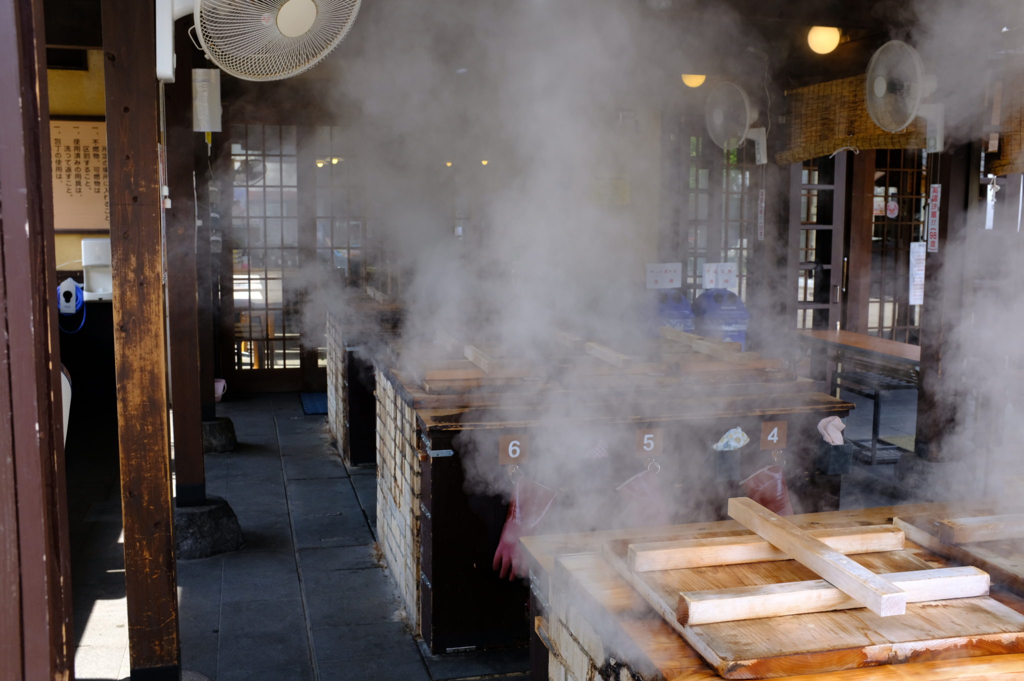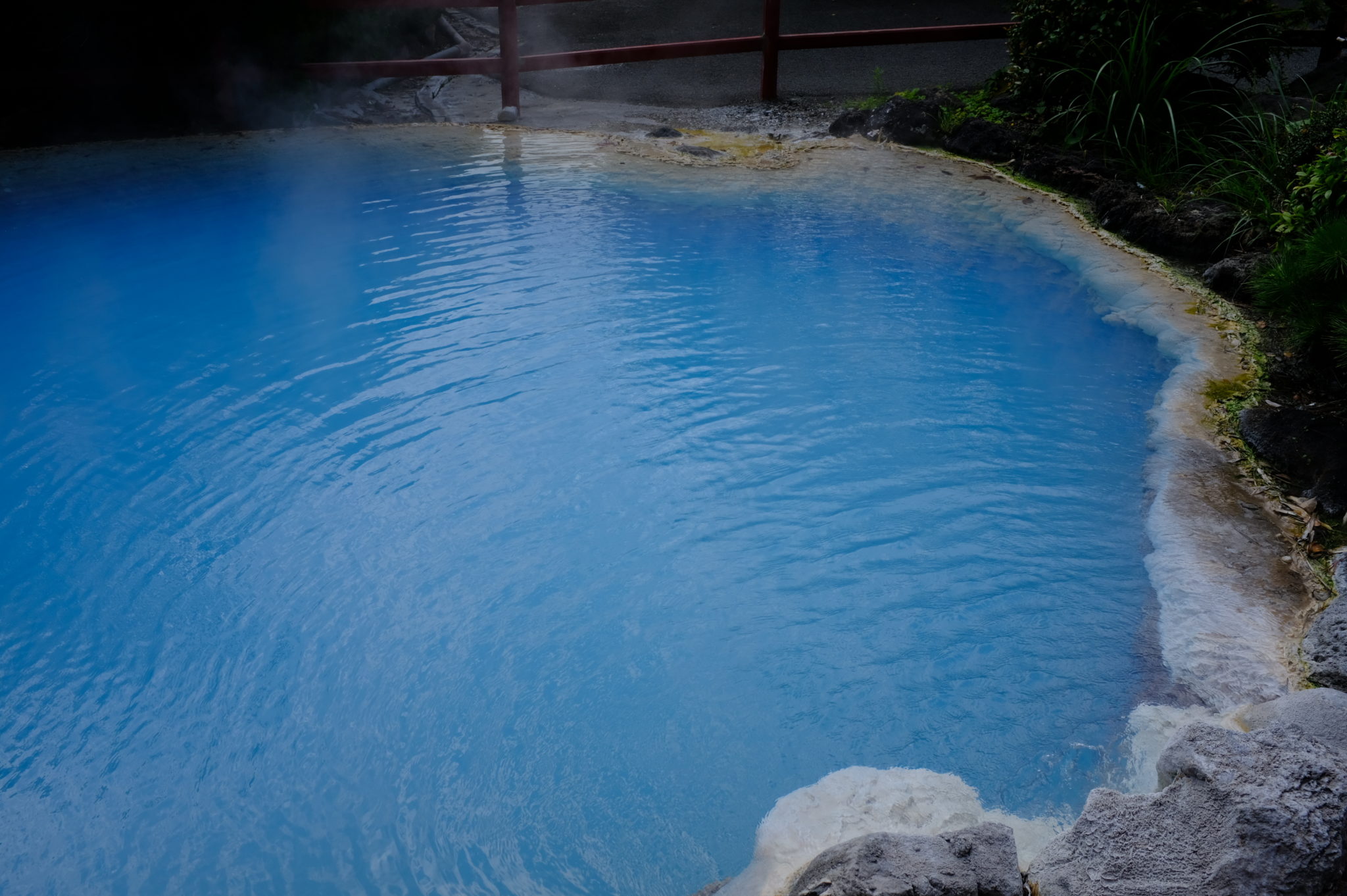 Am Nachmittag kommen wir in Beppu an. Wieder mal zu früh. Entspannt sitzen wir vor der Unterkunft und hängen unsere Füße ins Thermalwasser. Beppu ist die wohl berühmteste Onsen Stadt Japans.