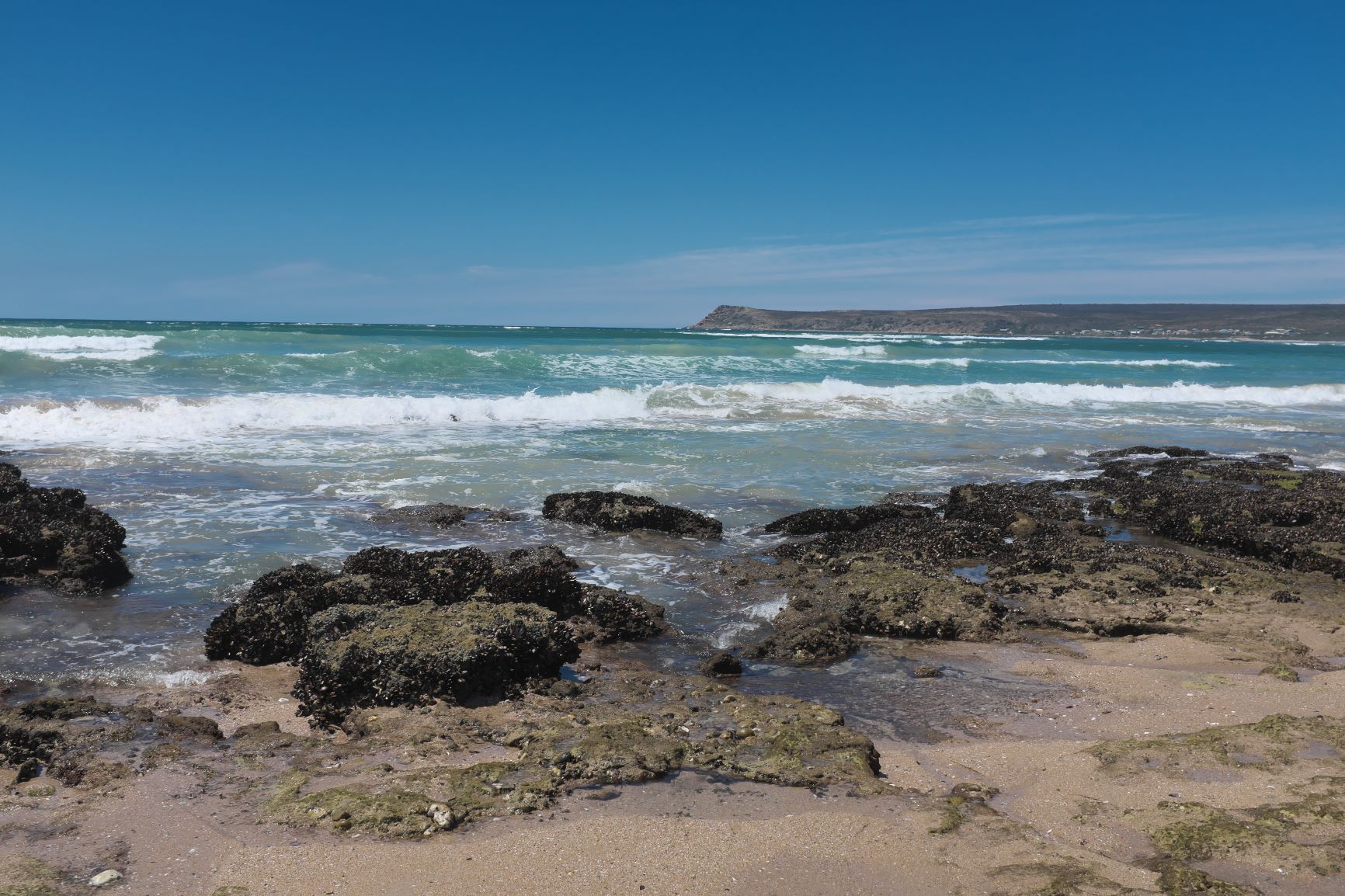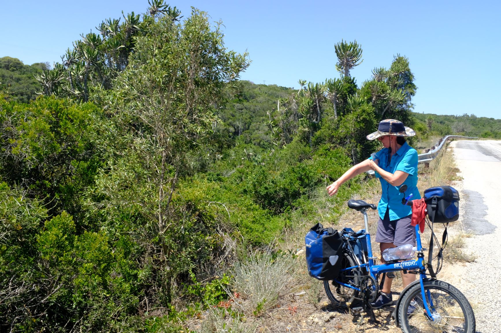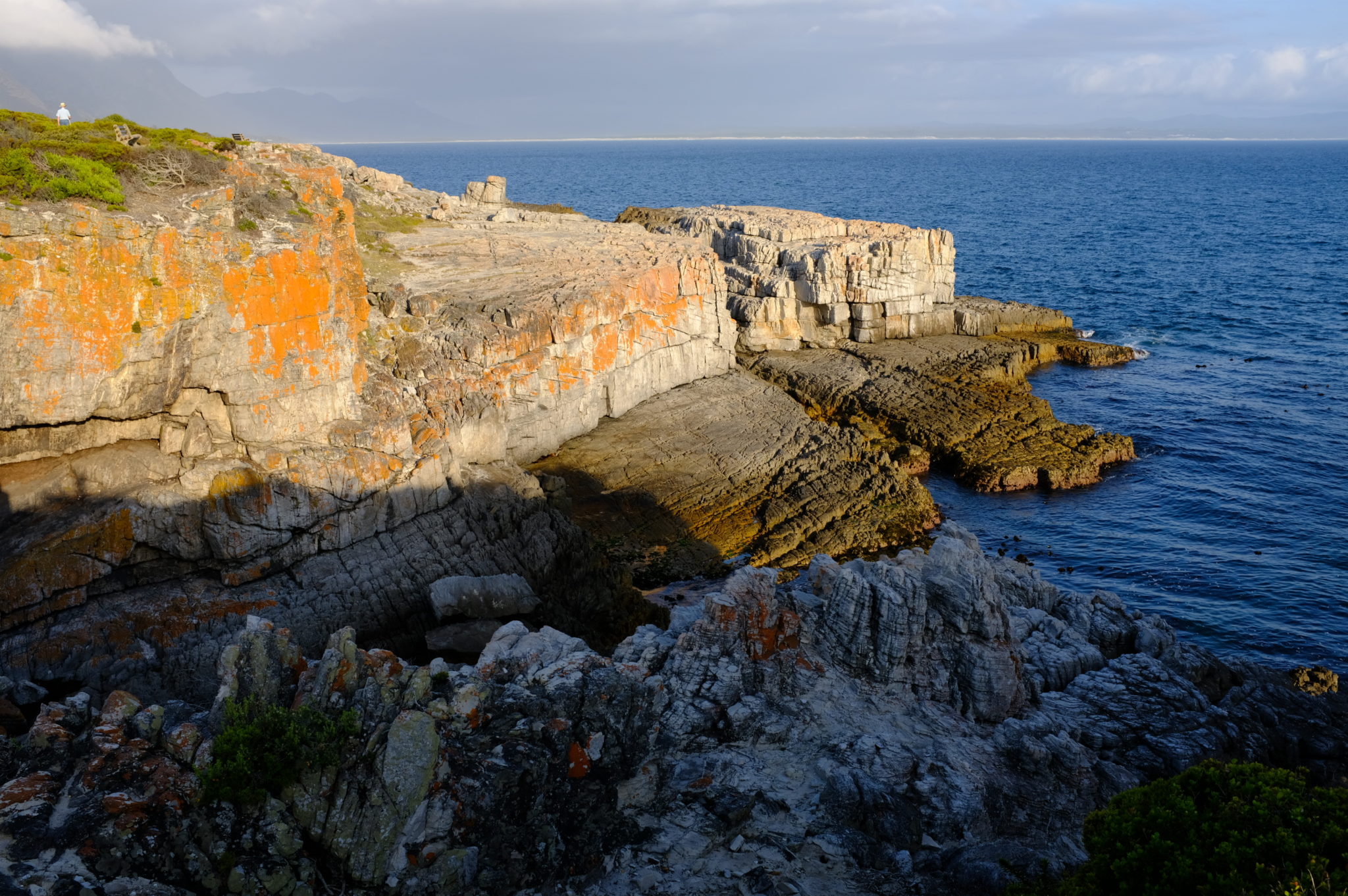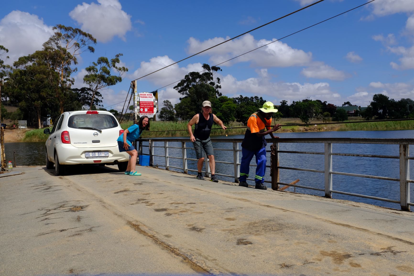 35 Kilometer bis zur Fähre über den Breede. Der Ponton wird mit Muskelkraft betrieben. Nach weiteren 30 Schüttelkilometern sind wir am Potberg. Hier machen wir eine einsame Wanderung. Die Wegmarkierungen sind schwer zu finden, es ist wie auf einer Schnitzeljagd. Nächste Station ist der De Hoop Nationalpark, der mit dem Potberg verbunden ist. Die riesigen weißen Sanddünen sind schon von weitem sichtbar. Wir gehen eine Strecke auf dem Walbeobachtungsweg. Wale sind aber schon seit Anfang Dezember nicht mehr hier. Je weiter man geht desto einsamer wird es, der ideale Ort für ein Bad. Die Felsformationen sind wieder mal atemberaubend.