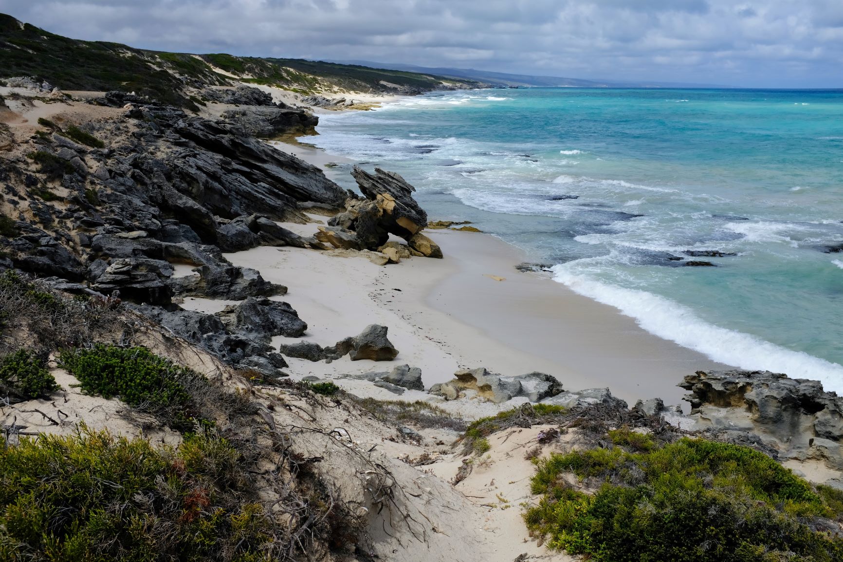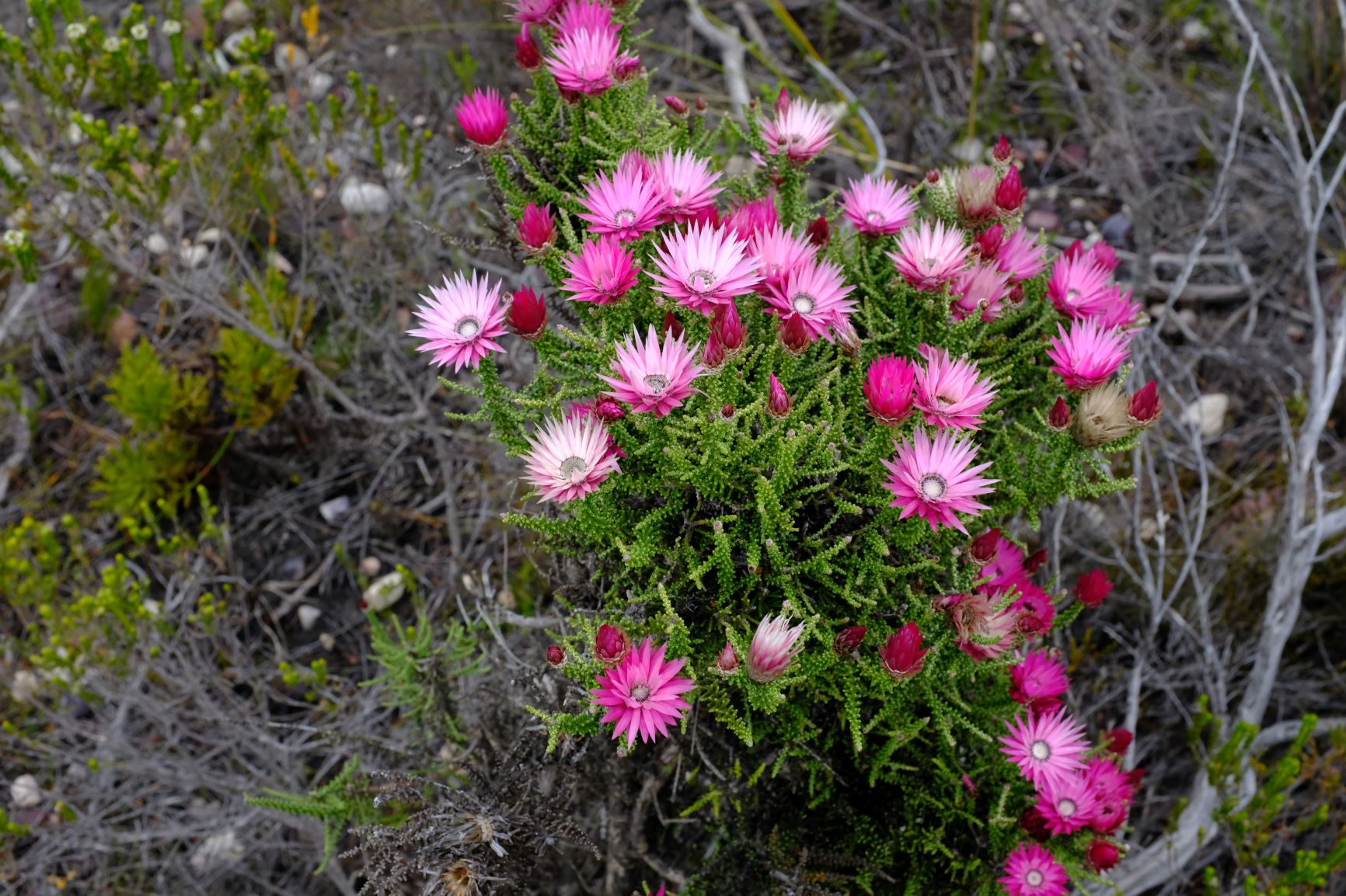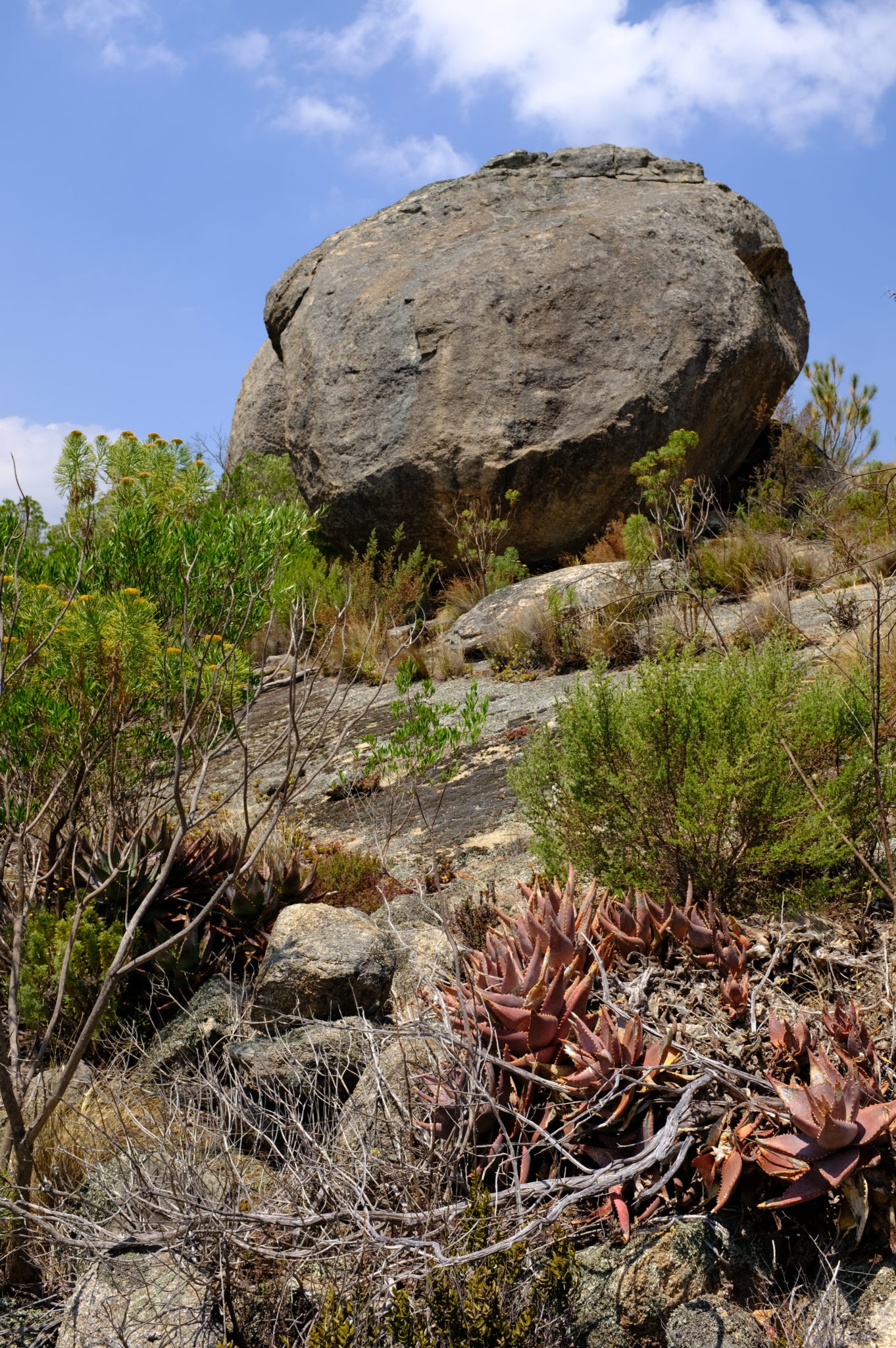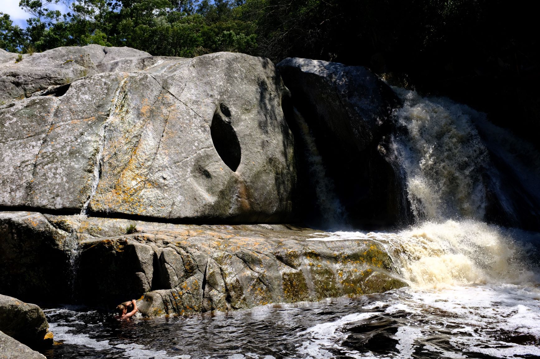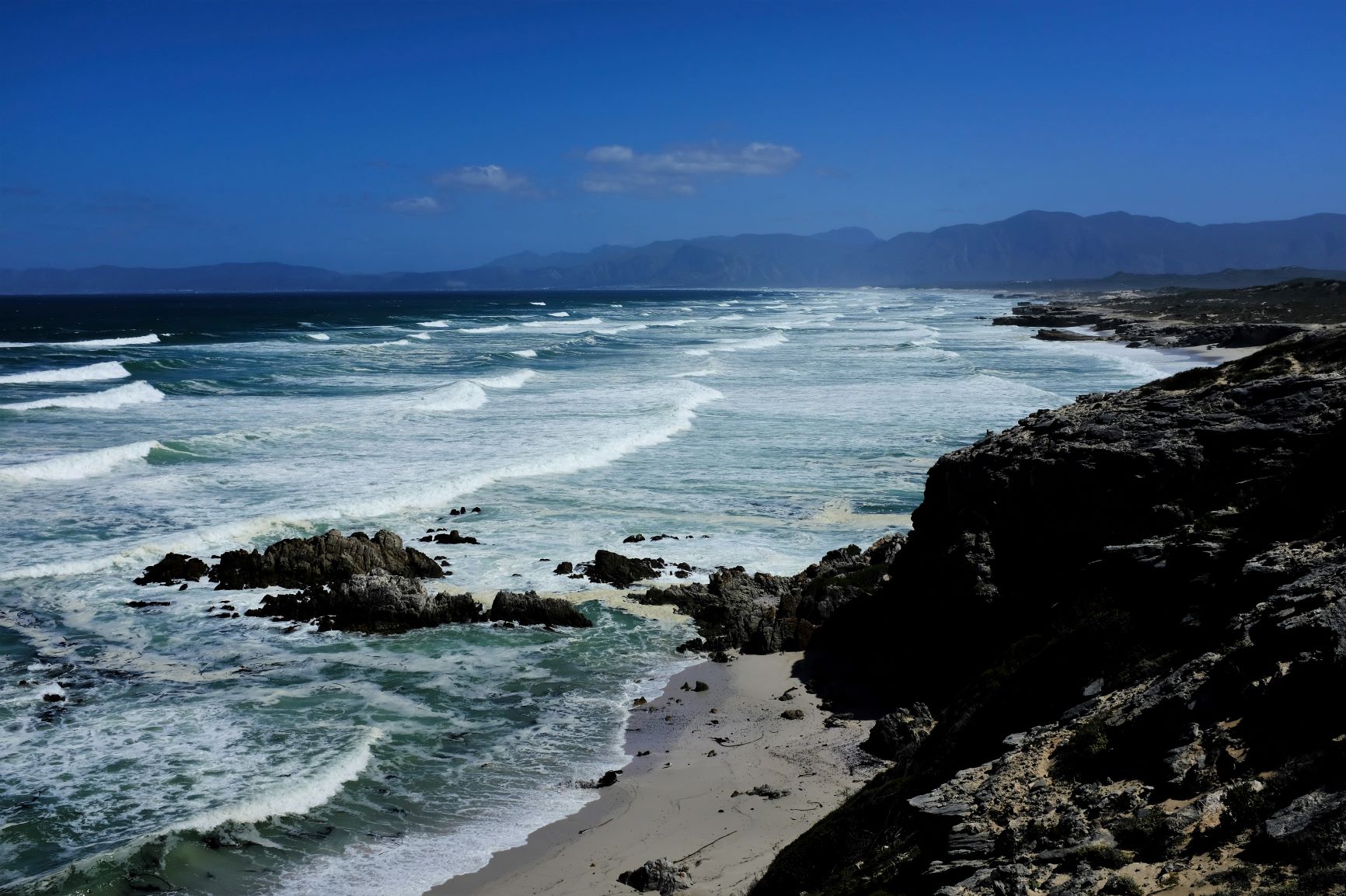 35 Kilometer bis zur Fähre über den Breede. Der Ponton wird mit Muskelkraft betrieben. Nach weiteren 30 Schüttelkilometern sind wir am Potberg. Hier machen wir eine einsame Wanderung. Die Wegmarkierungen sind schwer zu finden, es ist wie auf einer Schnitzeljagd. Nächste Station ist der De Hoop Nationalpark, der mit dem Potberg verbunden ist. Die riesigen weißen Sanddünen sind schon von weitem sichtbar. Wir gehen eine Strecke auf dem Walbeobachtungsweg. Wale sind aber schon seit Anfang Dezember nicht mehr hier. Je weiter man geht desto einsamer wird es, der ideale Ort für ein Bad. Die Felsformationen sind wieder mal atemberaubend.