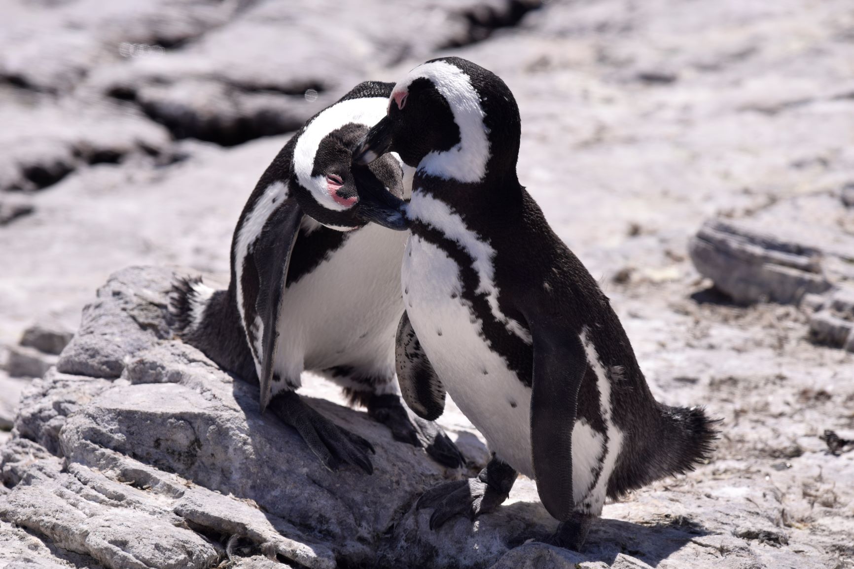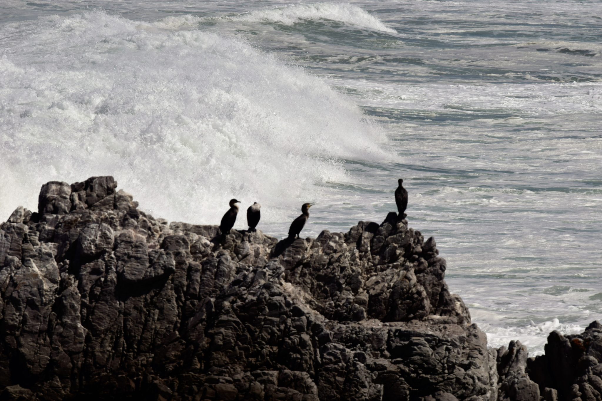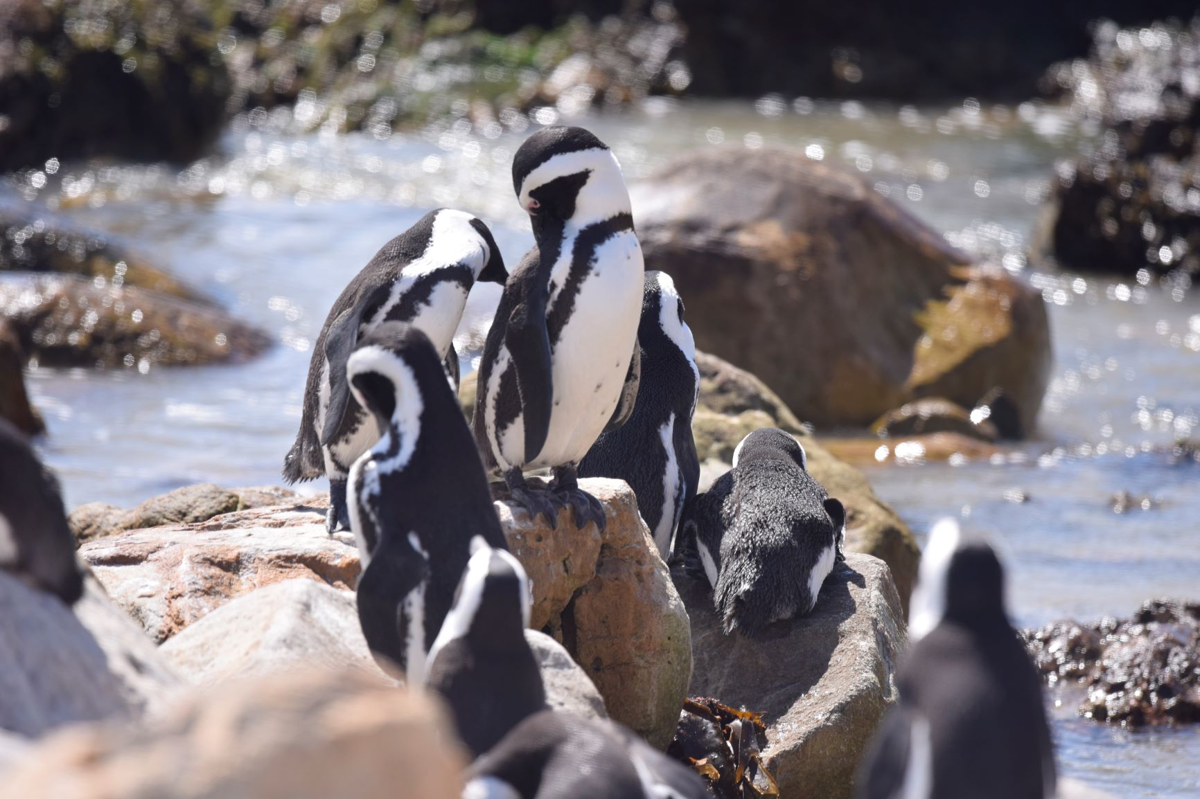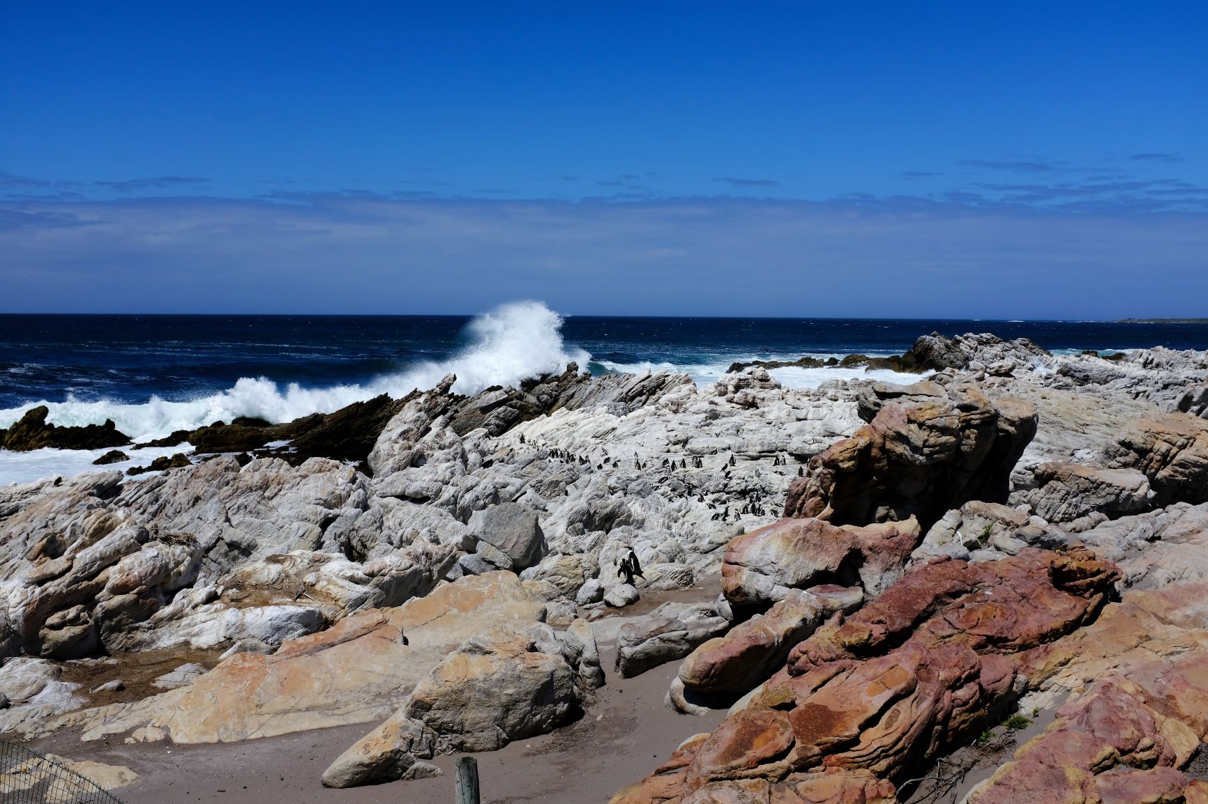 Fahrt zum Kogelberg Nature Reserve. Vorbei an frisch verbranntem Wald, Busch und auch so manchem Haus. Wegen der Brände und deren Löscharbeiten waren auch der Harold Porter Nat. Botanical Garden und der offizielle Zugang zum Kogelberg Nat. Reserve gesperrt, bzw. geschlossen. So ging es zum Stony Point, wo eine Kolonie afrikanischer Pinguine brütet. Die kleinen sind zwar schon beinahe ausgewachsen aber dennoch sehr schön zu beobachten. Auf einem Holzsteg kommt man ganz dicht ran. Schon alleine die Küste mit den bizarren Felsen ist sehenswert. Auf der Heimfahrt nach Hermanus bestiegen wir noch einen felsigen Berg auf der Suche nach den legendären Kapleoparden.