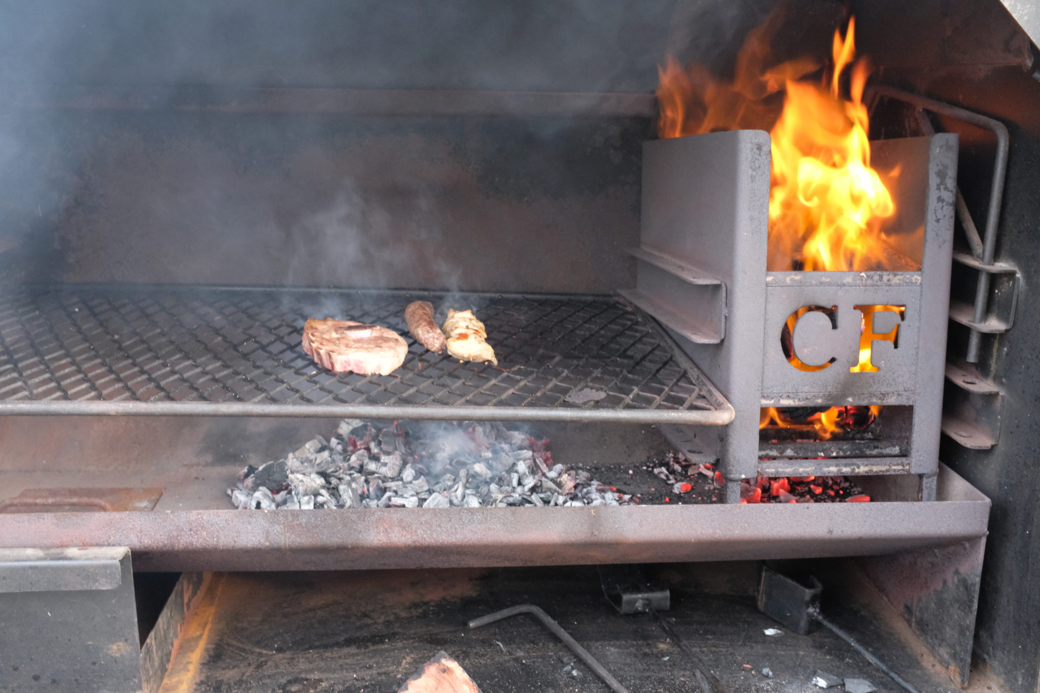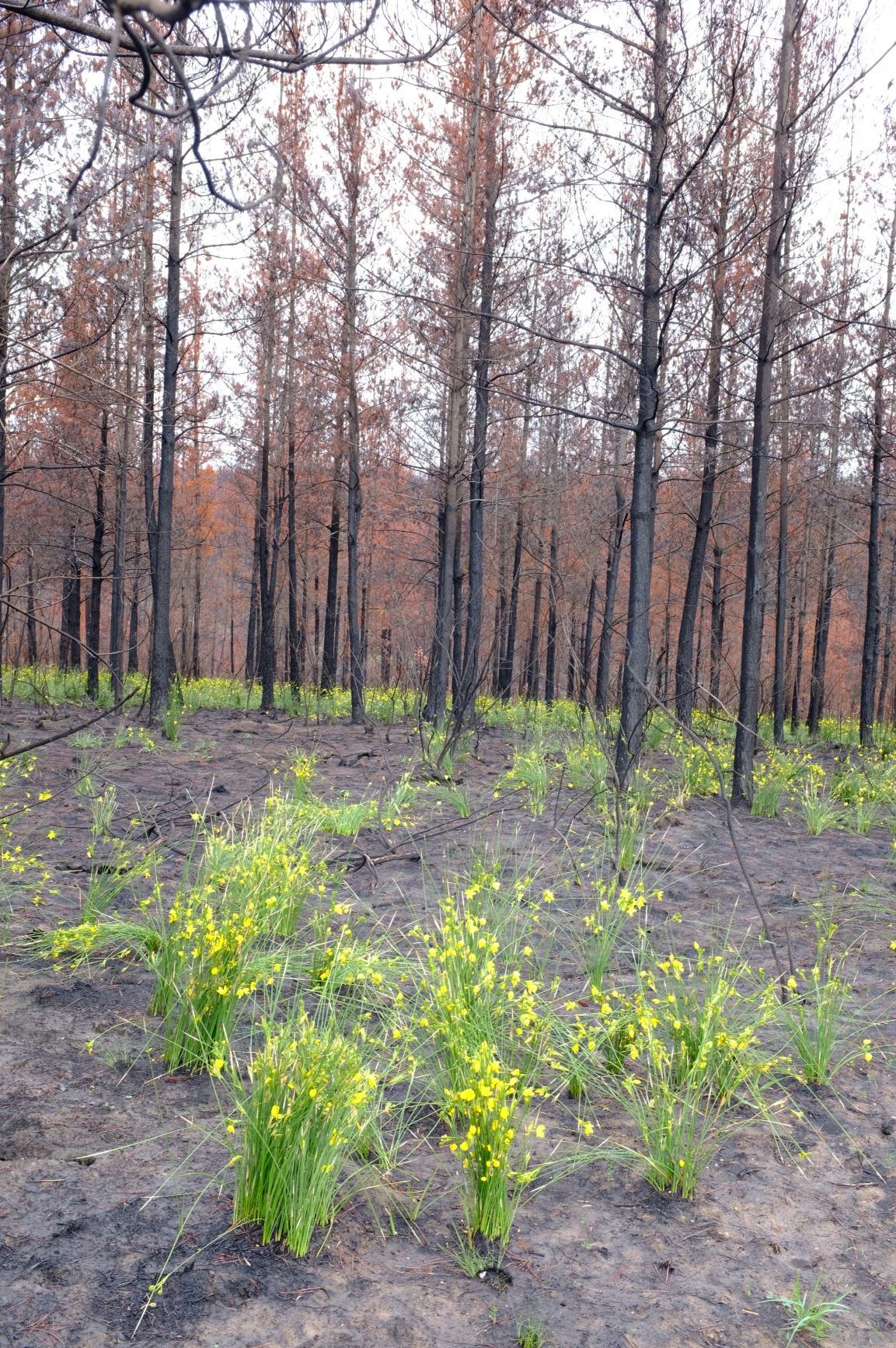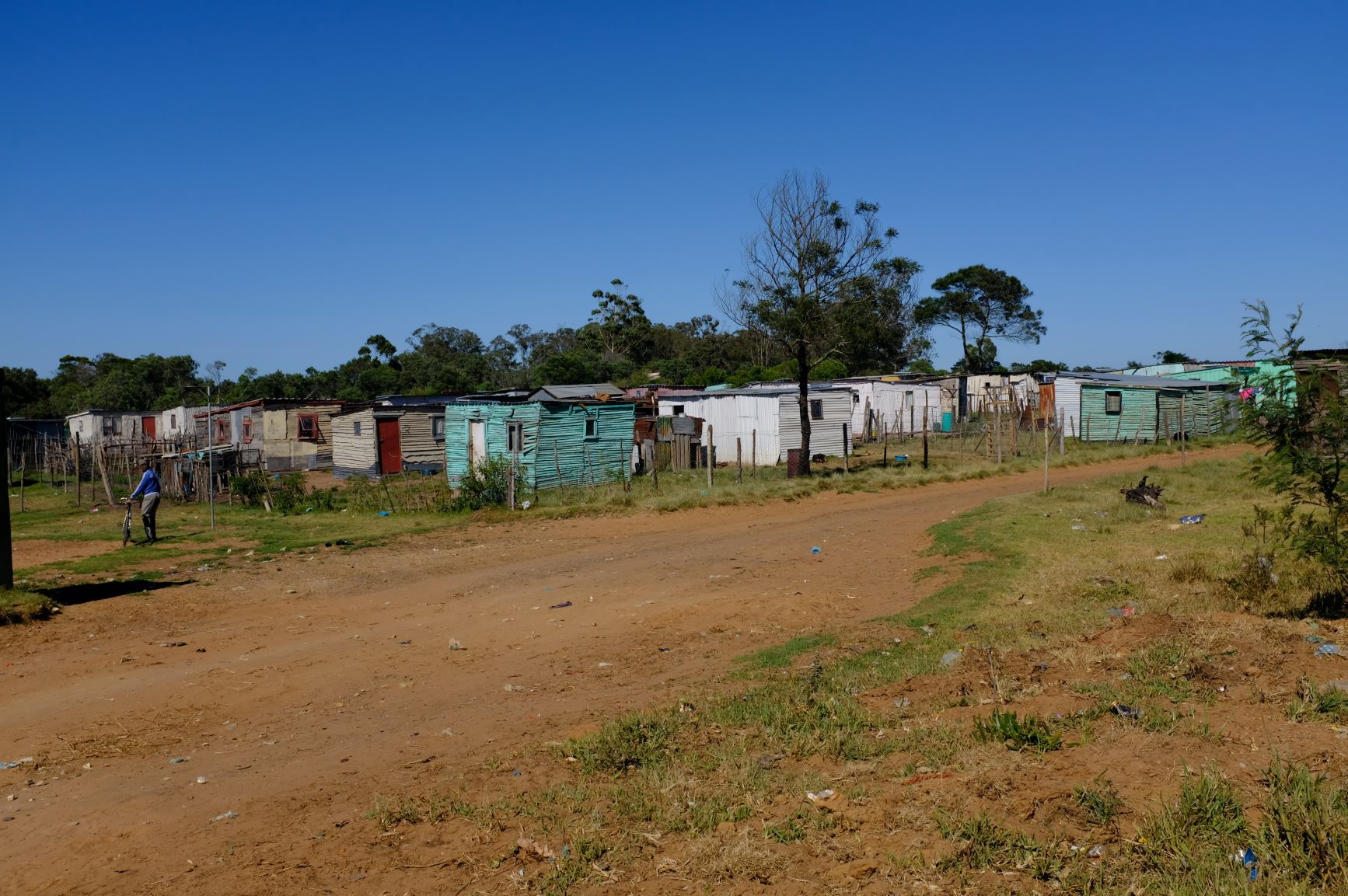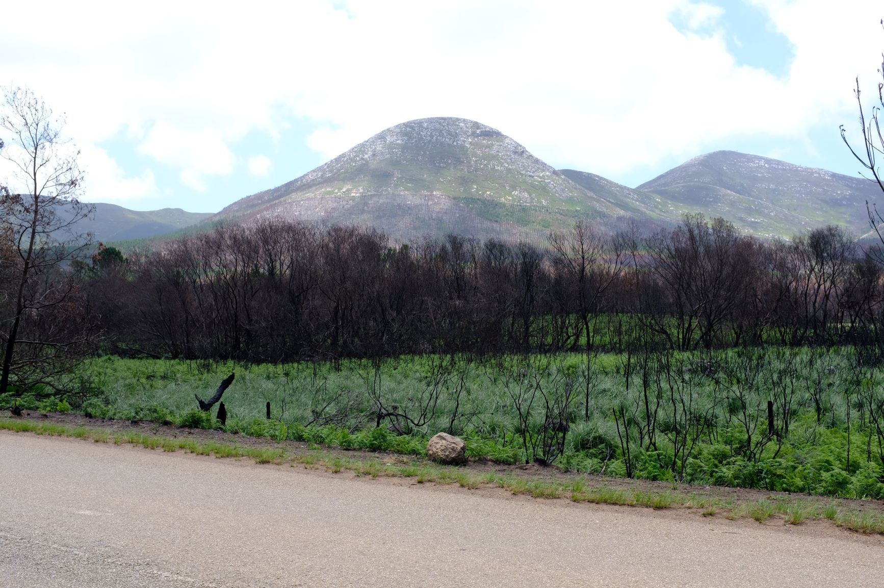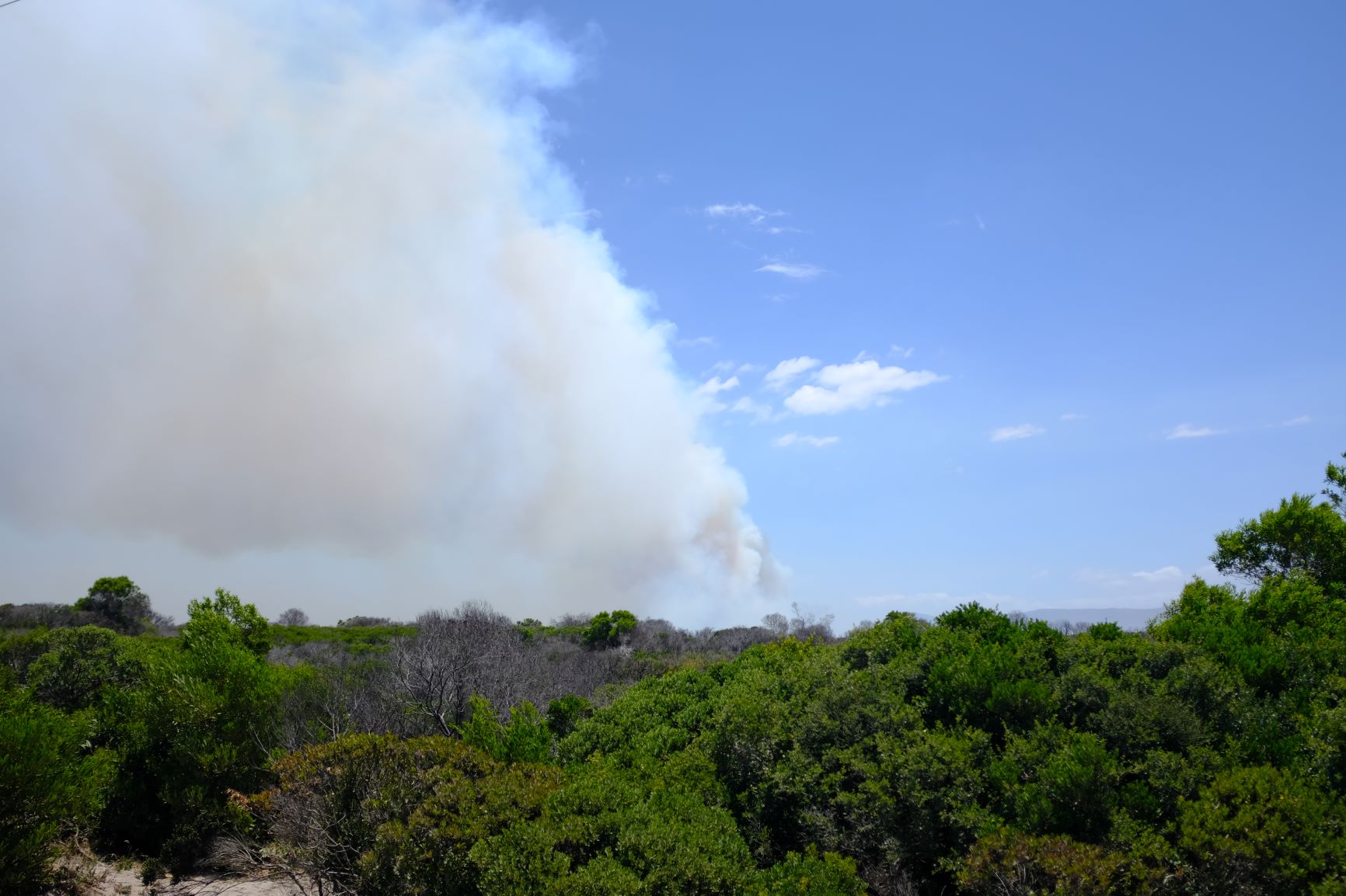 Vorbei an verbranntem Busch, der zum Teil noch qualmt. Frühstück dann bei Sparmarkt in Gansbai.