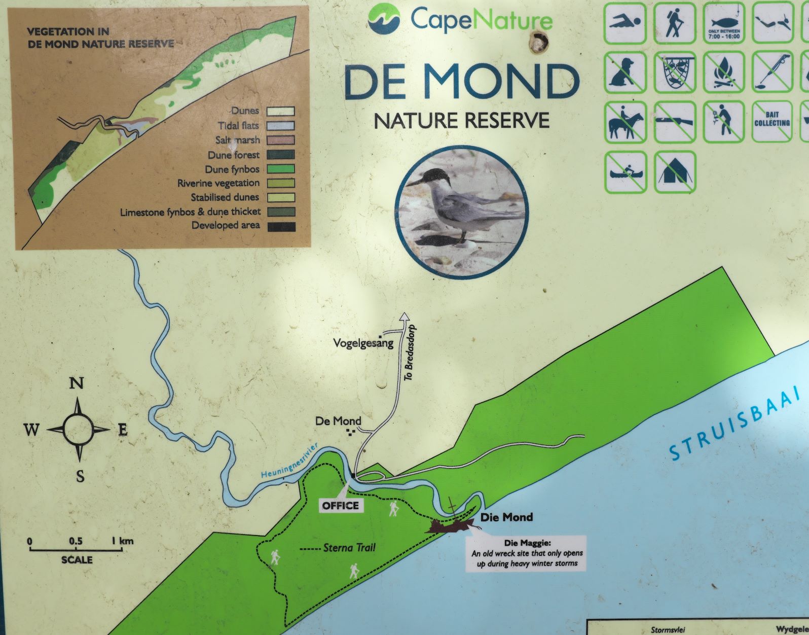 Weiter ging es zum De Mond Nature Reserve, das recht unbekannt und wenig besucht ist. Der 7 Kilometer Rundweg ist sehenswert. Zuerst geht es durch abwechslungsreiche niedere Buschvegetation, danach über den weißen Sandstrand zurück. Kurz vor dem Ende noch durch ein Vogelbrutgebiet.