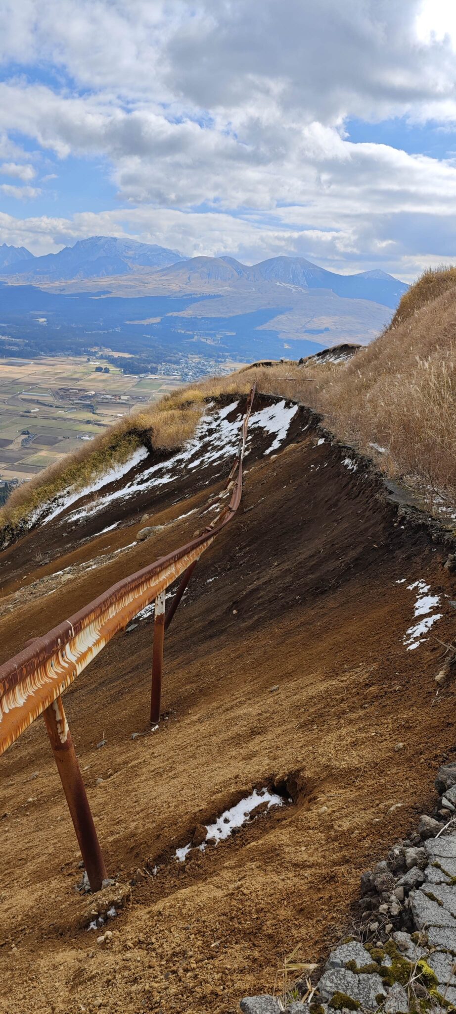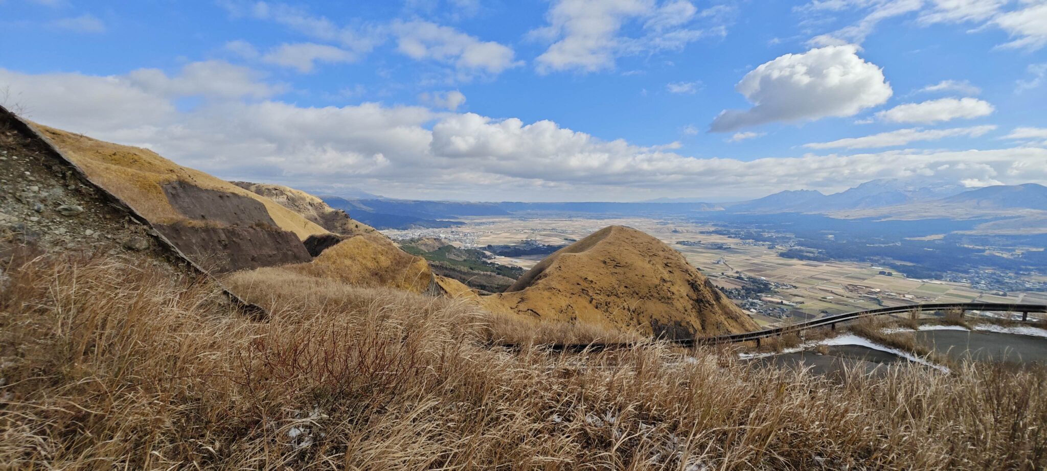 Die kleine Straße führt vom Kuju Plateau hinab nach Aso.